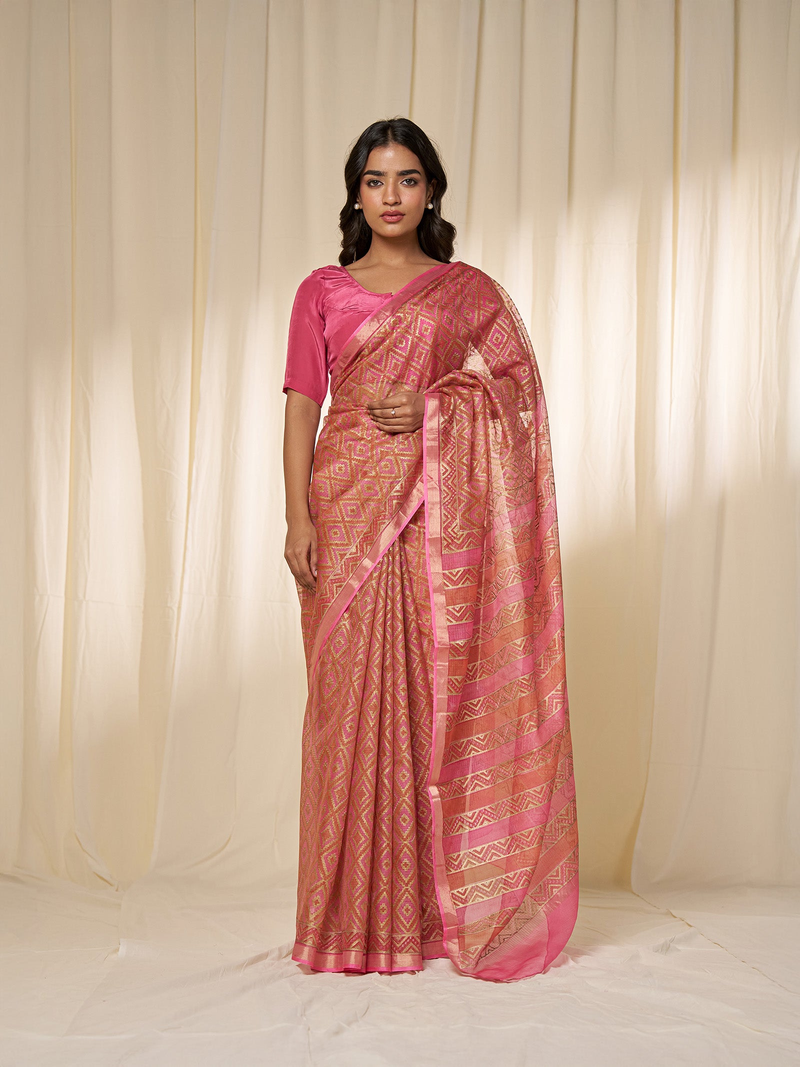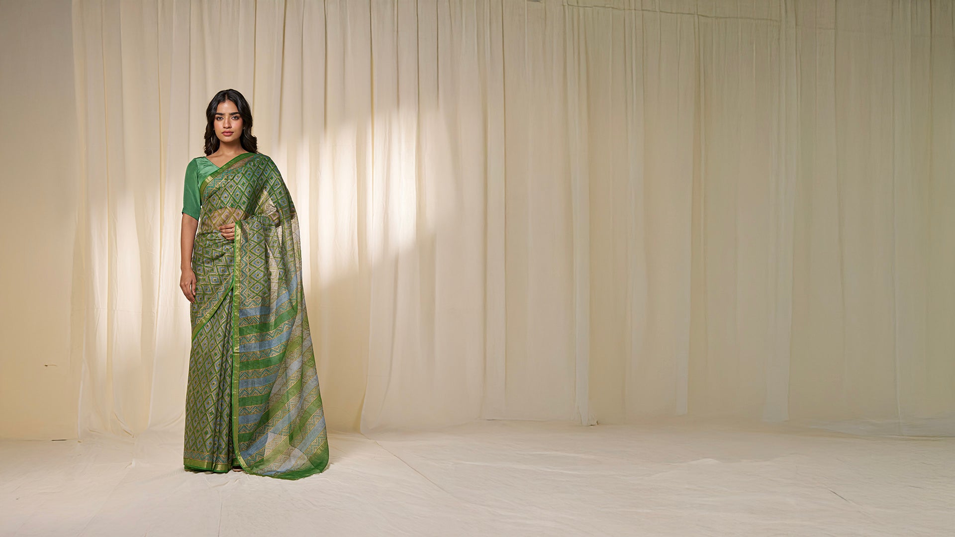 A beautifully hand block-printed Kota silk saree featuring a geometric diamond pattern in dark green, gold, and blue. It has a woven gold border, while the pallu carries chevron and stripe prints. This saree includes an attached, single-coloured blouse piece in a matching green.