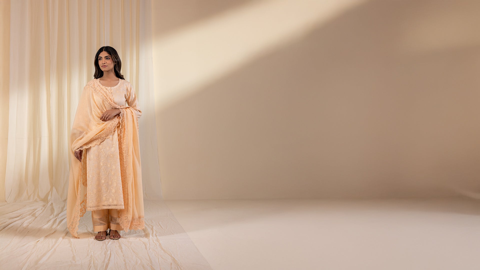 Echoing a vintage charm, the pastel peach dupatta is finished with an embroidered organza lace along all edges. The scalloped detailing on the lace adds a subtle and graceful touch to its overall look.