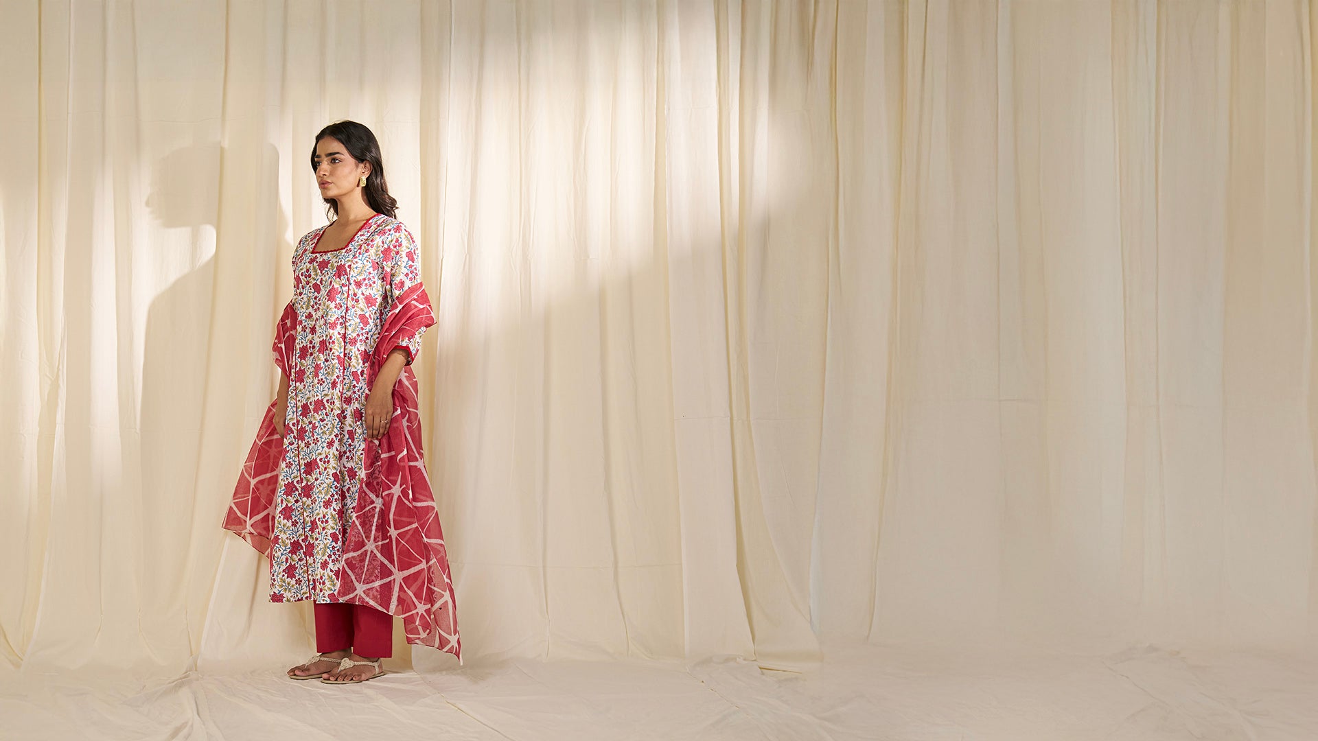 This white cotton A-line kurta features hand block prints of deep red flowers, turquoise vines and beige leaves. Red piping highlights the princess lines, while the square neckline and three-quarter sleeves are enhanced with red crochet lace hems. Paired dupatta and pants can be bought separately.