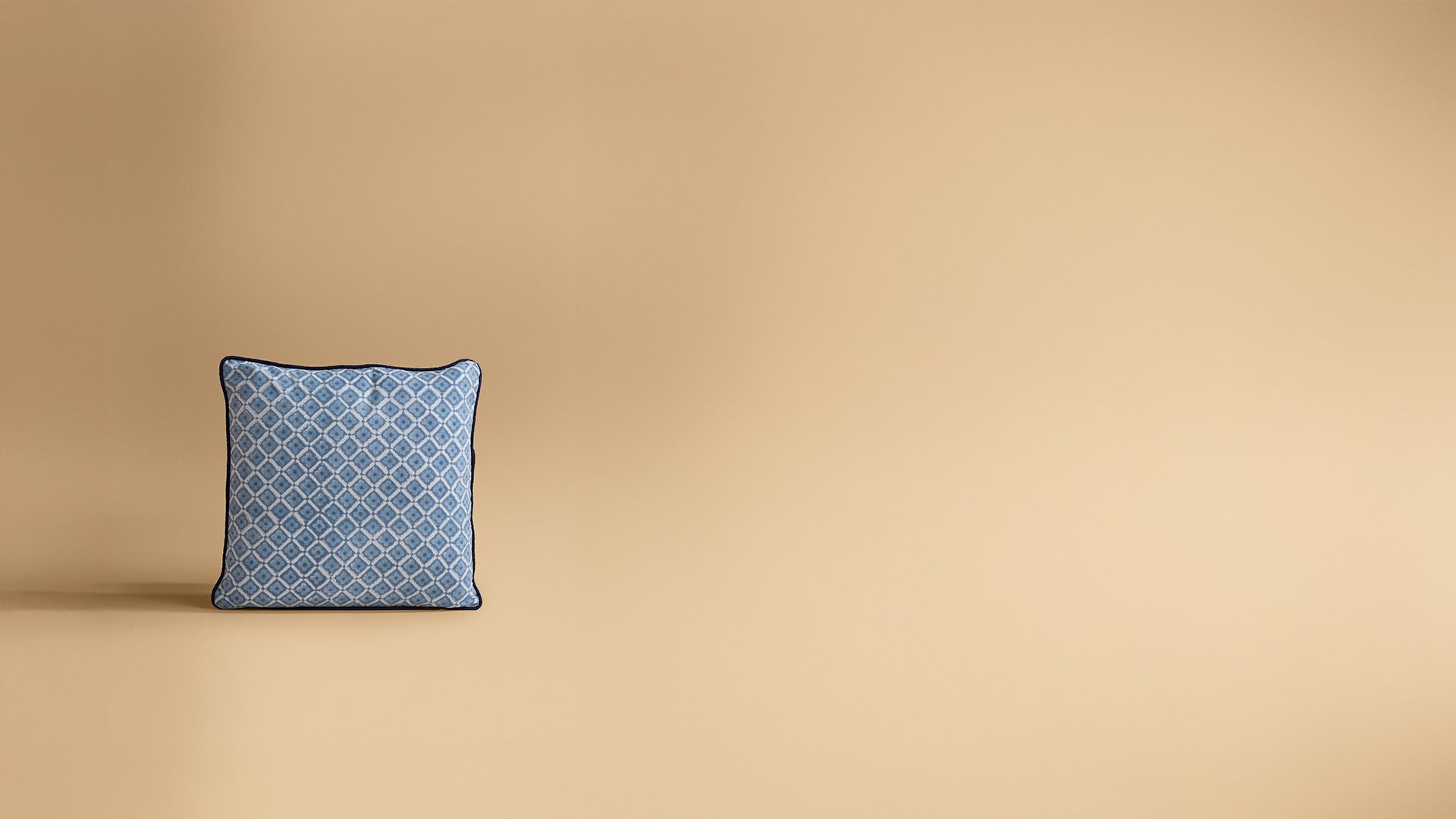 This medium-sized cushion cover showcases a floral geometric hand block print inspired by Moroccan tile motifs, forming a striking diamond pattern in shades of blue. The reverse features classic thin stripes in a single blue tone, while fine piping along the edges adds a neat, finished touch. Strong zippers ensure easy closure and the covers come without the fillers, which can be bought separately.