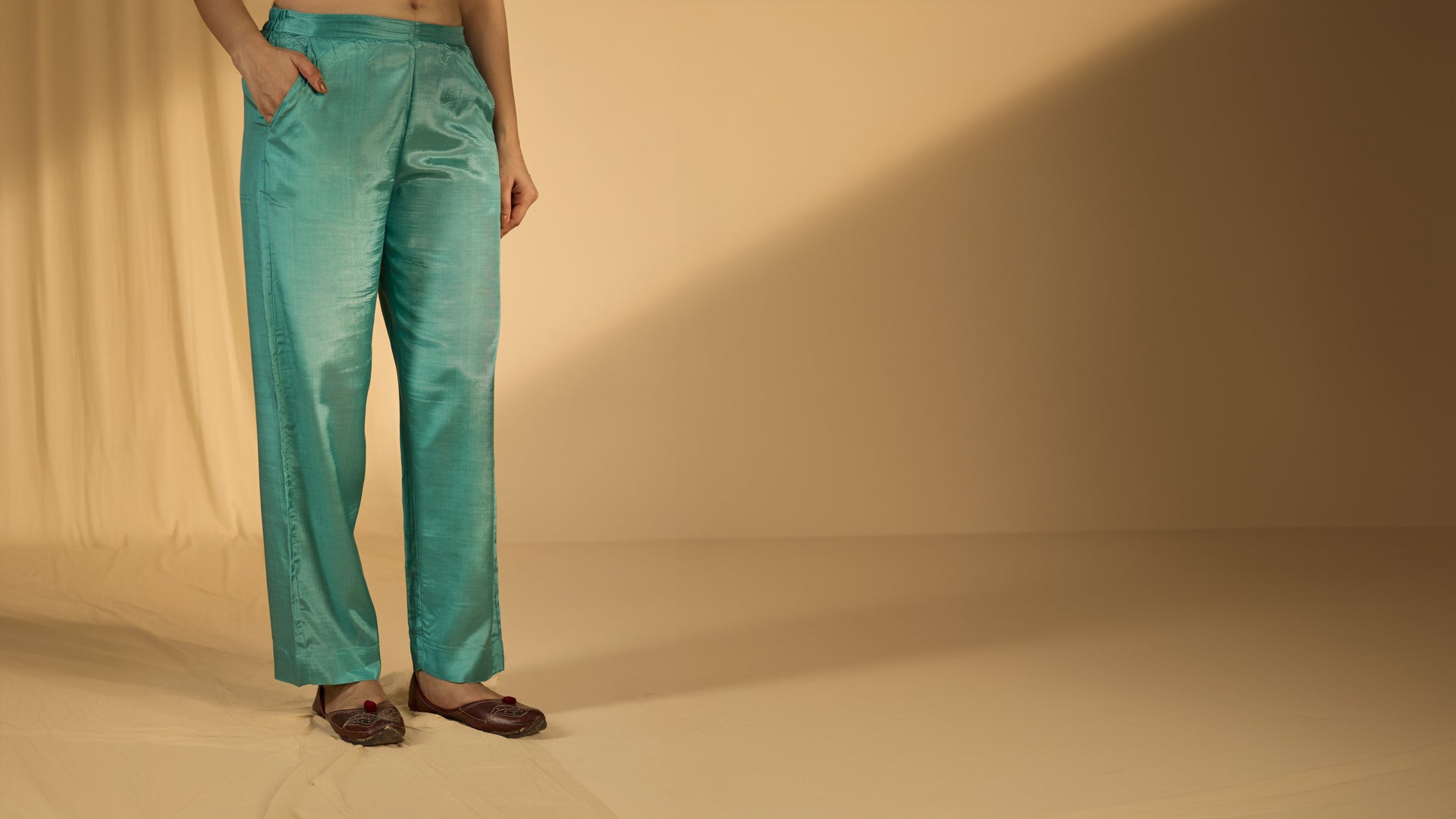 The Leaves Bamboo Silk Straight Pant combines luxury and comfort with its lustrous bamboo silk fabric in a soft teal shade. These straight-cut pants feature a semi-elasticised waistband and a sleek silhouette, perfect for adding a touch of elegance to your outfit, whether for a casual day out or a special occasion.