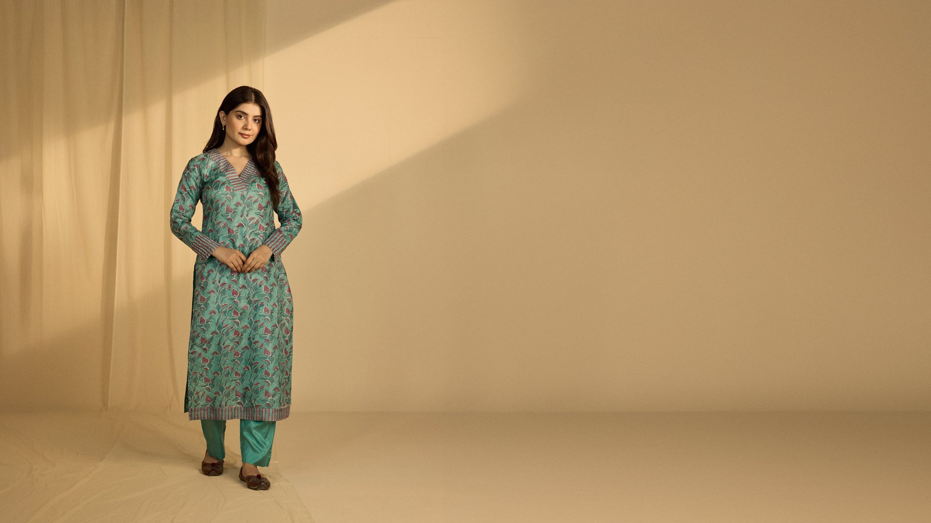 The Leaves Tussar Silk Kurta showcases a hand-block printed design with a blend of green and muted pink tones, highlighting a leaf motif. It features a V-neckline with contrasting striped and sequinned Embellishment and coordinated sleeve cuffs. This kurta is crafted from Tussar silk, offering a light, elegant drape, suitable for various occasions.