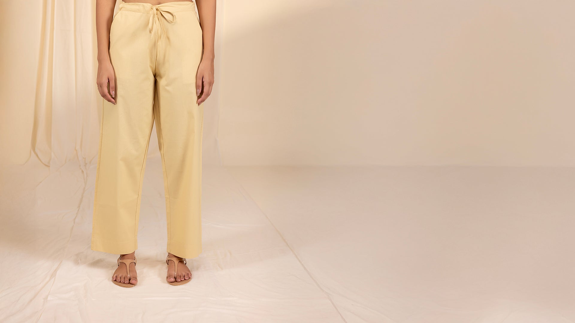 These light yellow straight-cut cotton pants feature a semi-elasticised waist with a drawstring for comfort and fit. Designed with two side pockets, they offer both ease and practicality for everyday wear.