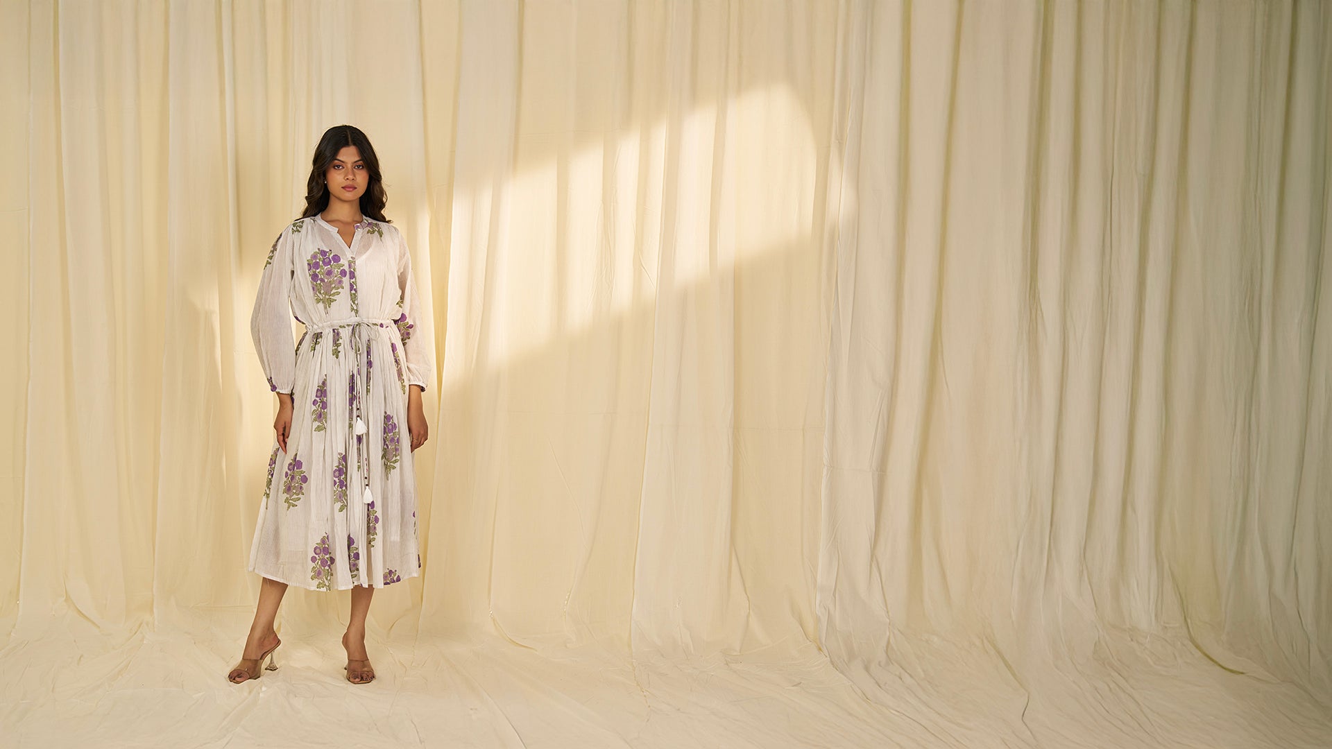 This relaxed-fit dress with a mandarin collar and peasant sleeves is hand block printed with large chrysanthemum motifs in shades of lavender and green on a fine grey striped base. The waist can be cinched with a drawstring to create soft gathers. It's sold as a two-piece set with a long cotton slip.
