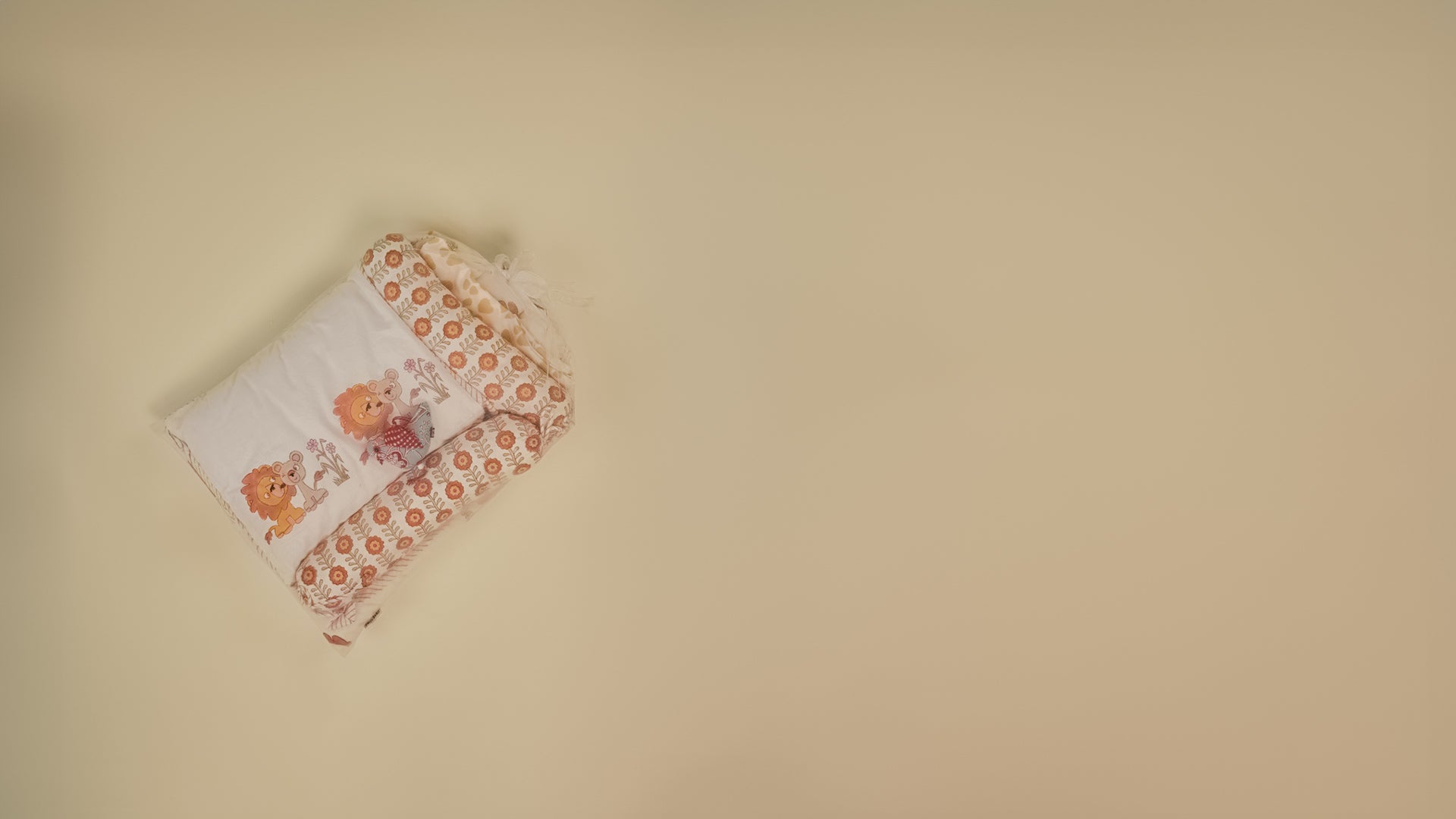 A Lion and his cub adorn this crib set which includes 2 bed sheets, 1 pillow, 1 quilt, 2 bolsters, and a baby hanging. Made from fine mulmul with pure cotton filling, the vibrant wild animal block print adds cheer all year round. Packaged in a beautiful net bag, perfect for gifting.