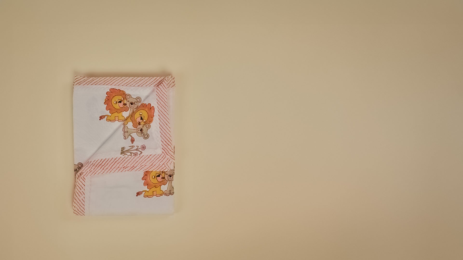 The Lion Kisses Dohar features a charming cartoon-like hand-block printed design of a lion father and his cub, surrounded by playful flowers. Crafted from soft cotton, this dohar is bordered with a red striped trim.