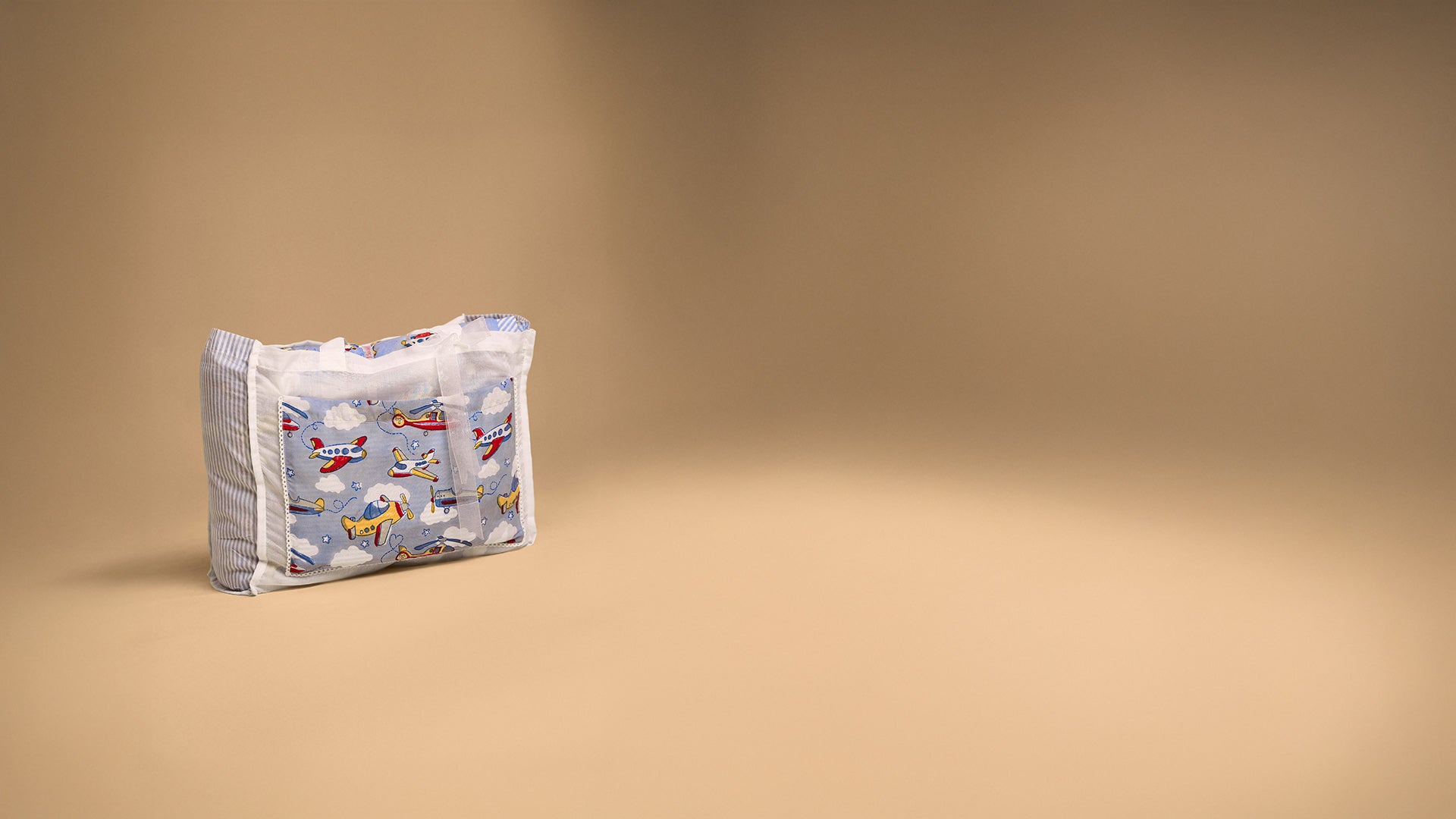 This reversible children's quilt features a cheerful print of red, yellow, and blue airplanes and helicopters flying across soft blue skies filled with clouds and stars. The reverse side features elegant stripes. Hand quilted with natural cotton filling, it includes two matching pillowcases and comes neatly packed in a handcrafted bag.