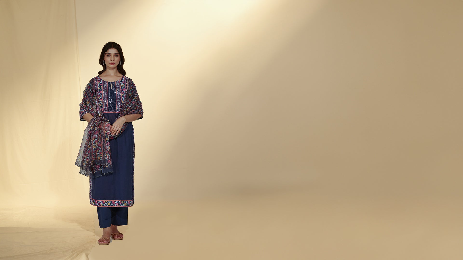 This Kota Doria cotton dupatta is adorned with hand-block printed yellow and red flowers on sky blue vines, creating a beautiful and vibra