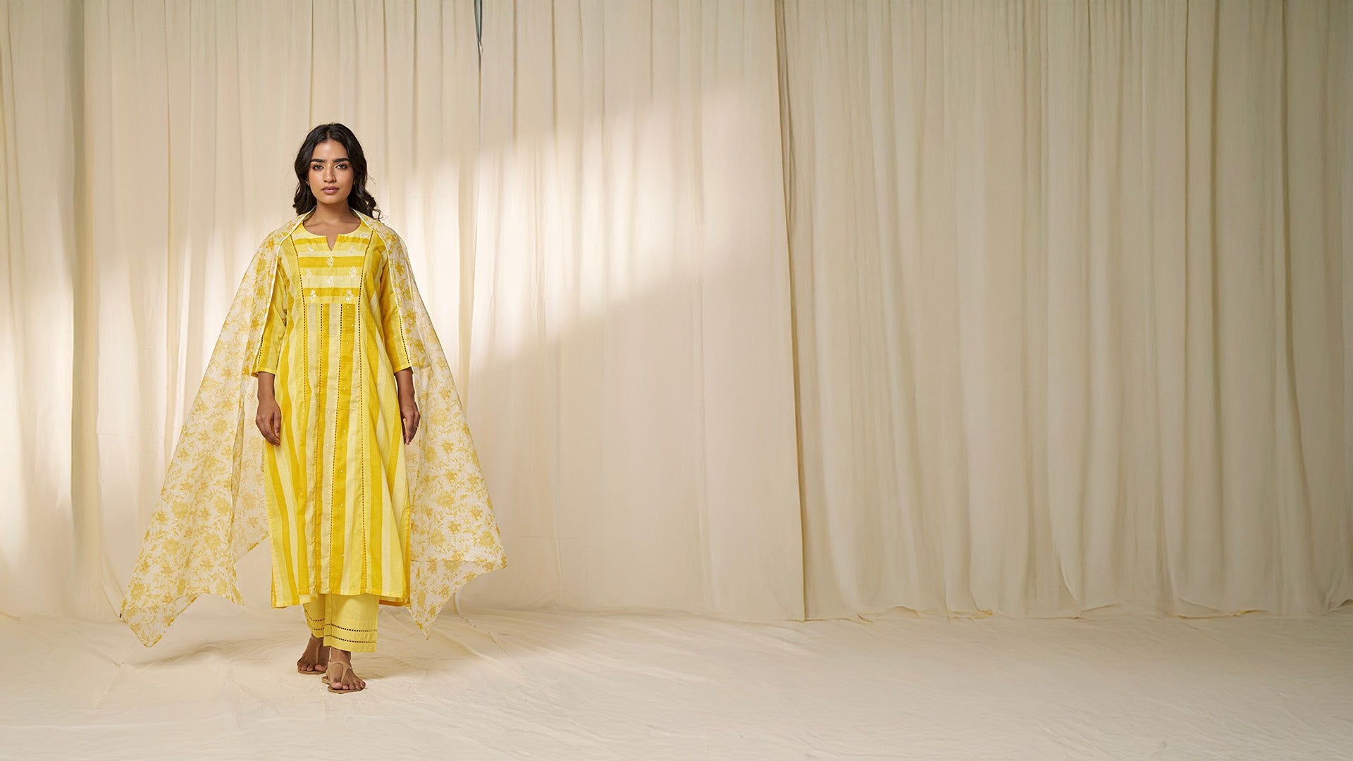 Like rays of the sun this bright yellow cotton kurta is hand block printed in vertical yellow tone stripes. It features a round neckline with V slit and its princess cut lines are enhanced with crochet window lace. The sleeves are designed with the same window lace detailing. The yoke is floral embroidered for added elegance.