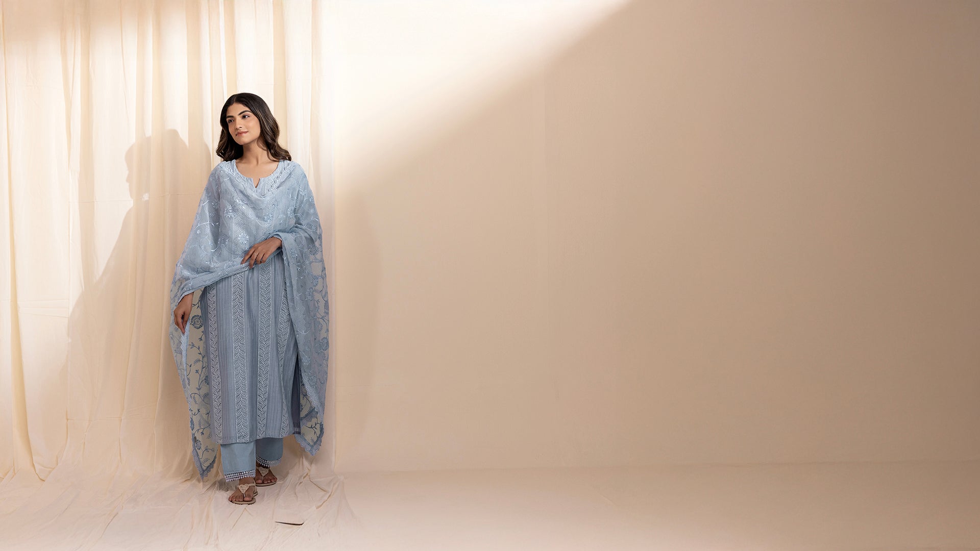 This shimmering Lilac Chanderi kurta is designed in a straight cut, rounded v neck and finished with intricately emboridered floral lace on its 3/4 sleeves. Vertical pintucks run parallel to wide crochet lace panels patterned with delicate leaf motifs. Soft voile lining ensures comfort, giving a refined, elegant look, suitable for day night.
