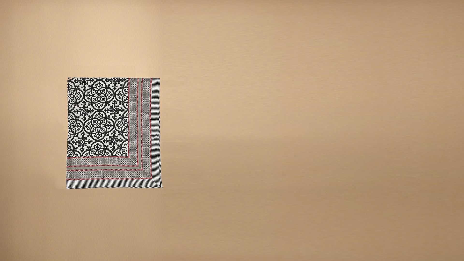 The hand block printed bedcover is printed in colours black, stone grey with a touch of scarlet.