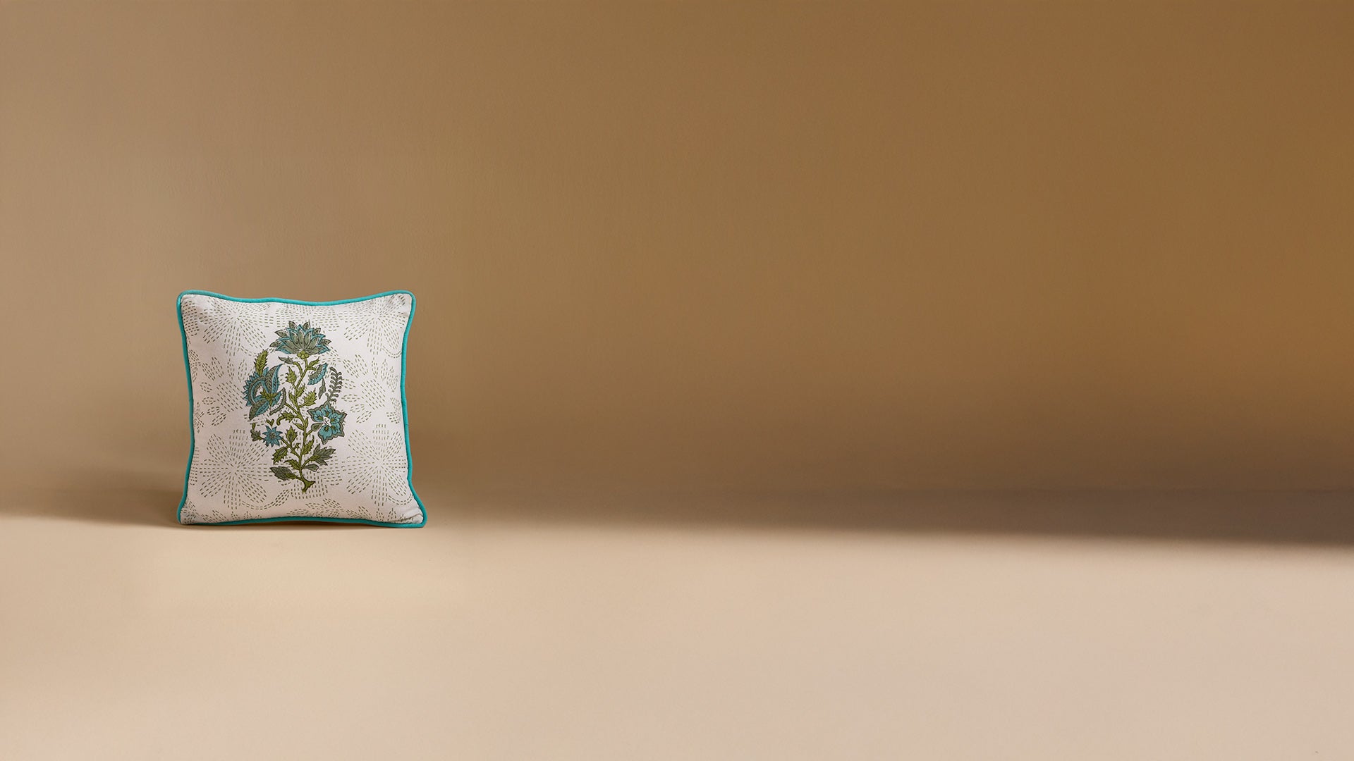 These small cotton covers, hand-block printed in teal and shades of green, offer a reversible charm. One side features a grand Mughal-inspired boota, while the other showcases elegantly arranged alternate borders for a versatile and artistic touch. Strong zippers ensure easy closure and the covers come without the fillers, which can be bought separately.