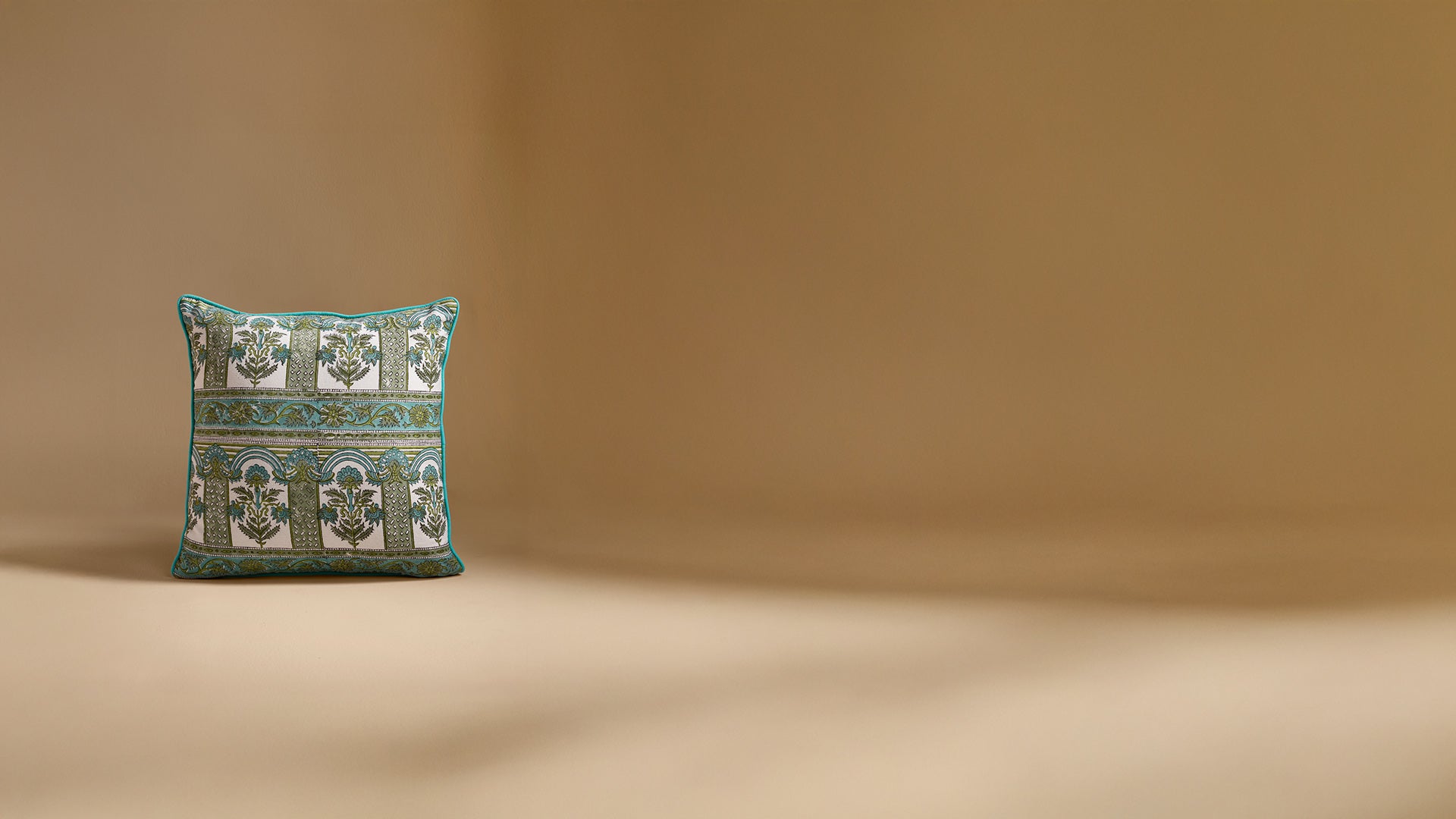 These medium sized cotton covers, hand-block printed in teal and shades of green, offer a reversible charm. One side features a grand Mughal-inspired boota, while the other showcases elegantly arranged alternate borders for a versatile and artistic touch. Strong zippers ensure easy closure and the covers come without the fillers, which can be bought separately.
