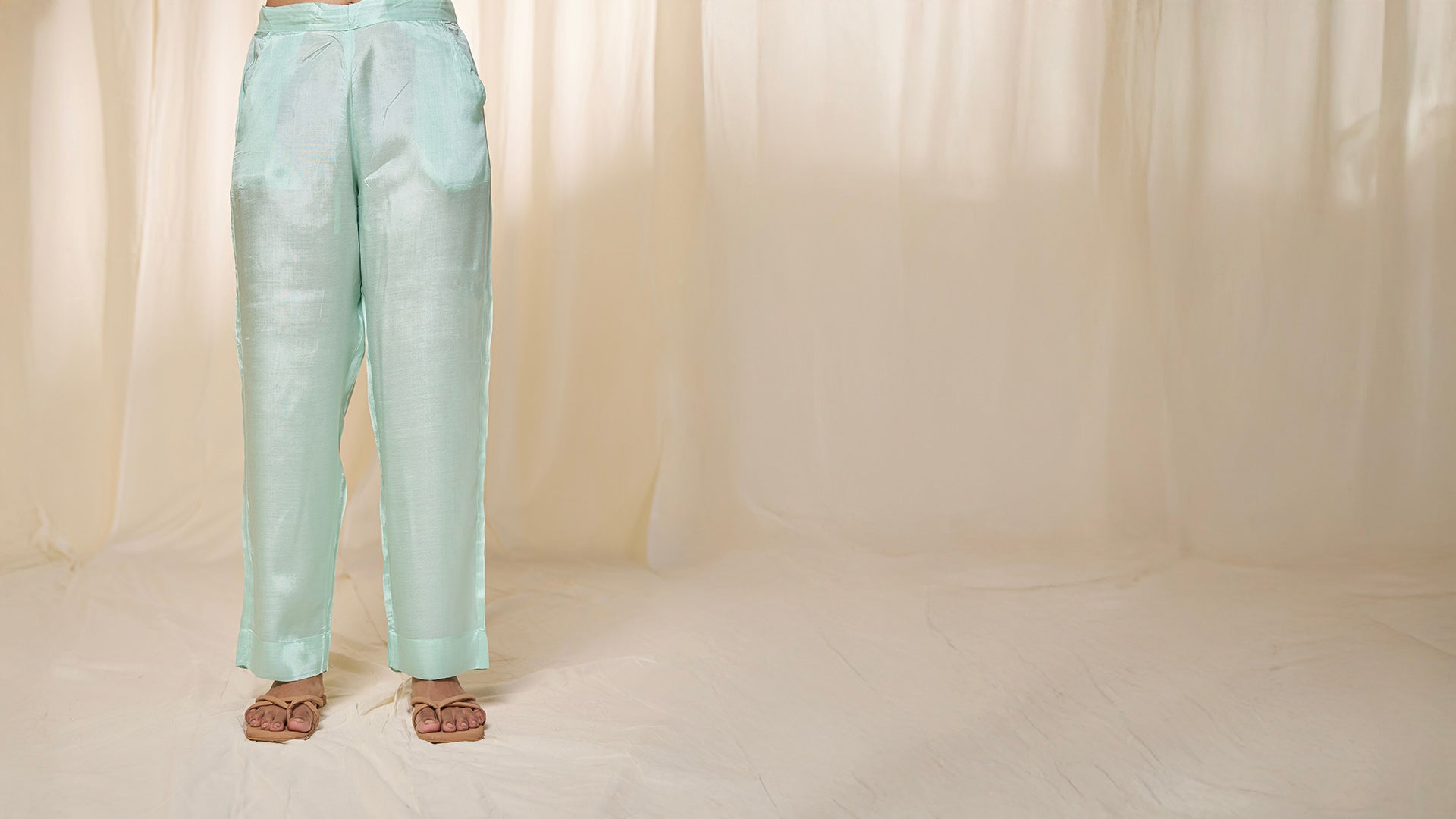 Mint green Assam silk pants with a semi-elasticised waistband, internal drawstring, and two side pockets. Designed for both elegance and comfort, these versatile pants can easily complement Western or traditional wear.