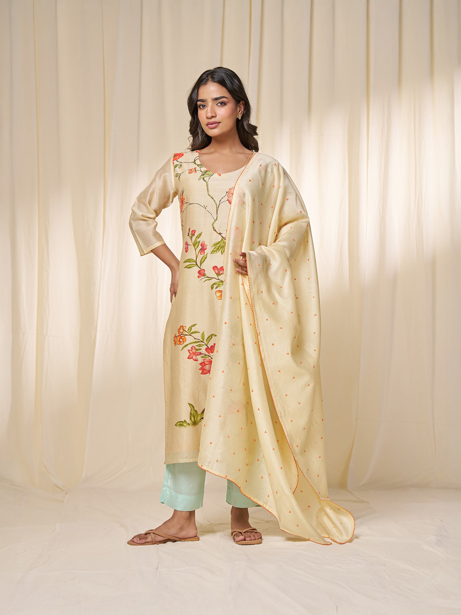This exquisite chanderi kurta features an ombre design blending mint green and pastel orange tones, adorned with a vibrant floral vine print in striking oranges and lush greens, highlighted.