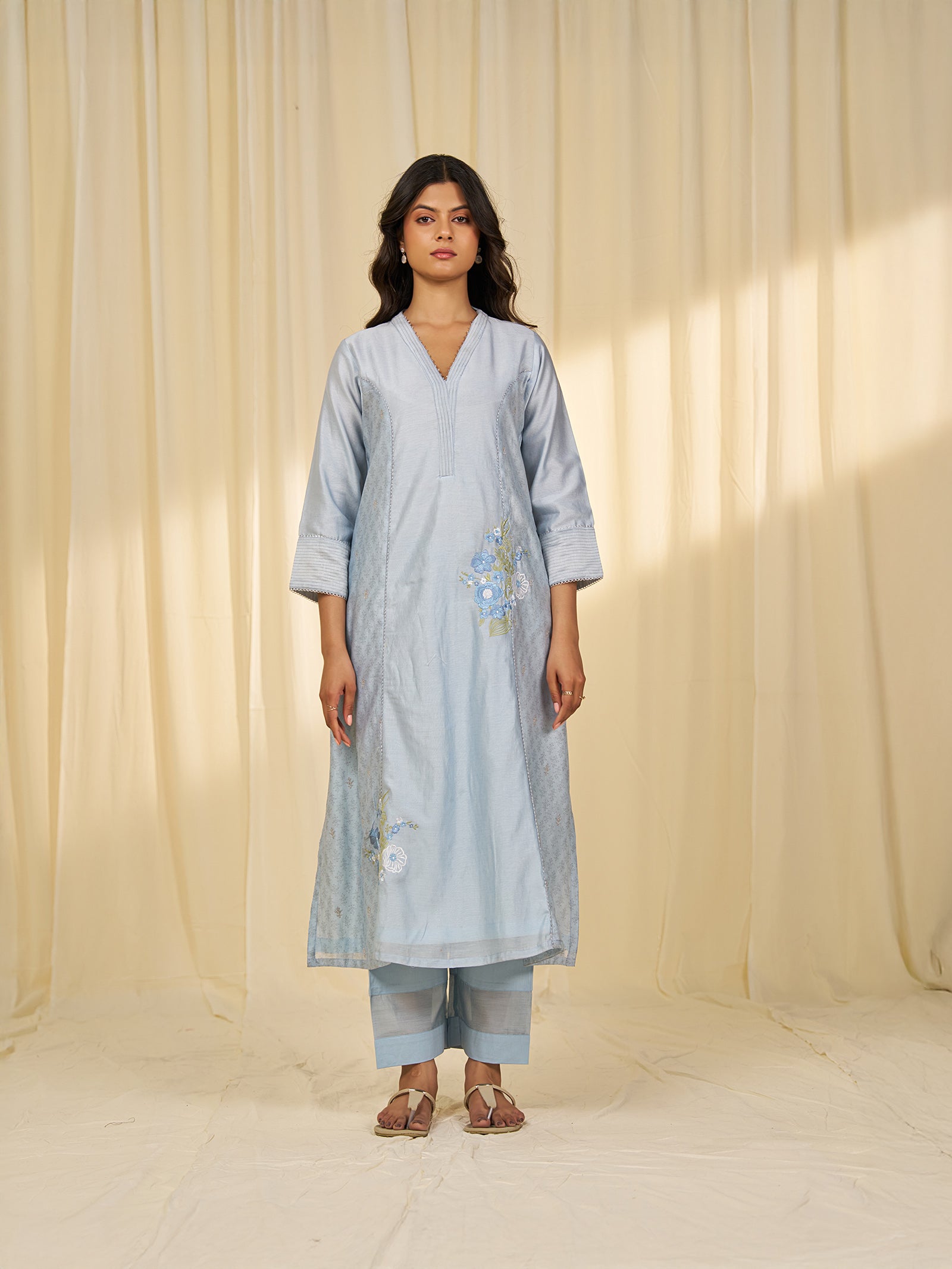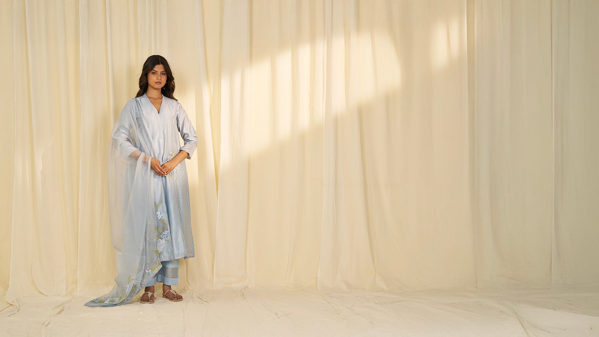 The dusty cool blue organza dupatta has subtle dot embroidery across the middle. Each end features floral and leaf embroidery in blue, white, and green on organza and chanderi. The hems are trimmed with silver scalloped lace.
