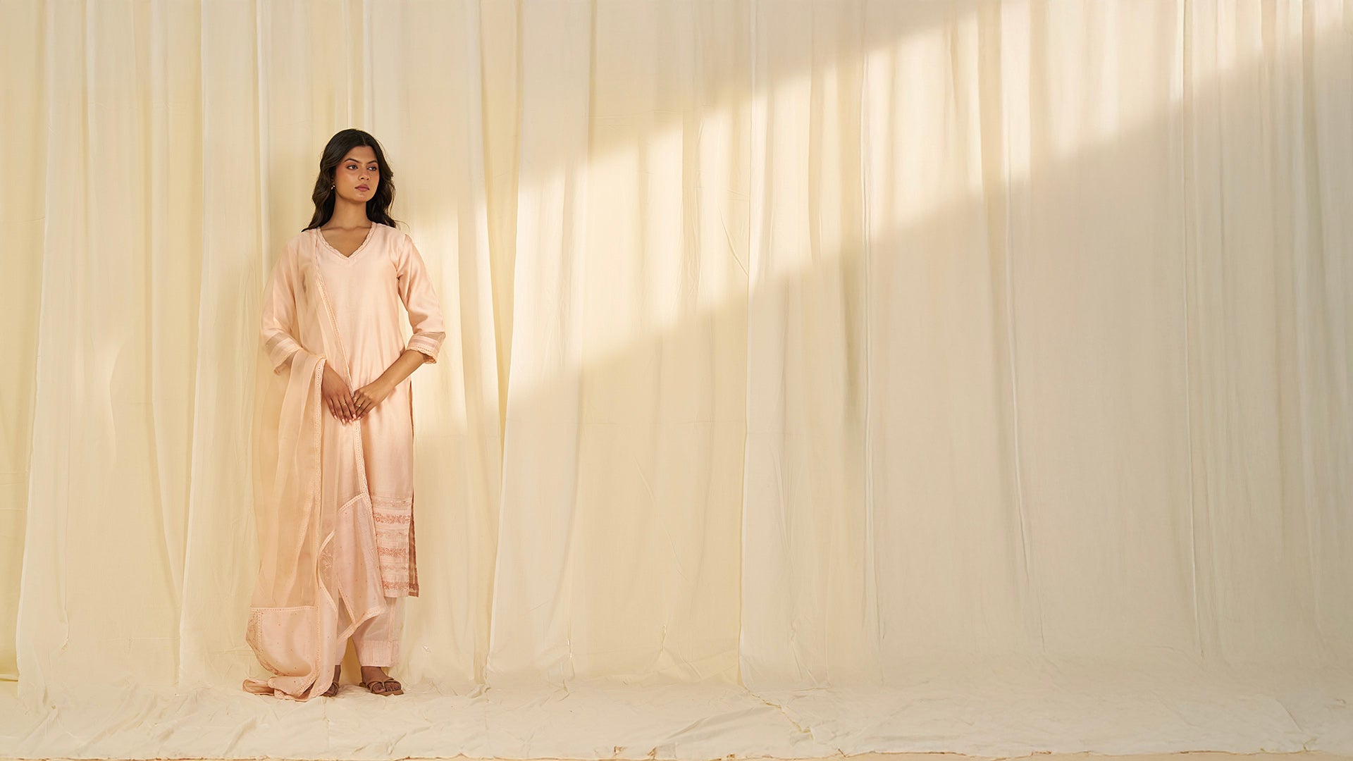 This blush peach Chanderi straight-cut kurta with a V neckline embodies a soft, elegant feel. Crochet lace with silver thread detailing accents the neckline and sleeve hems, while embroidered organza panels create an interesting lower half to the kurta. It is lined with voile and its three-quarter sleeves feature organza panels too. Paired dupatta and pants can be bought separately.