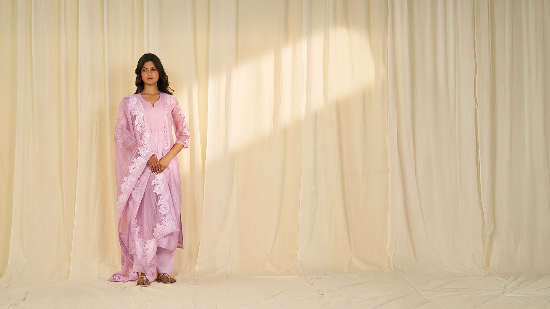This lilac pink Chanderi kurta is designed in an elegant A-line silhouette with a split round neckline. The organza yoke is embellished with glass bead and sequin floral accents. Intricate pintucks define the body, complemented by floral lace on princess panels. The three-quarter organza sleeves are embroidered with a floral lace pattern. It is lined with voile and finished with tiny crochet lace on the side slits and hem. Paired dupatta and pants can be bought separately.