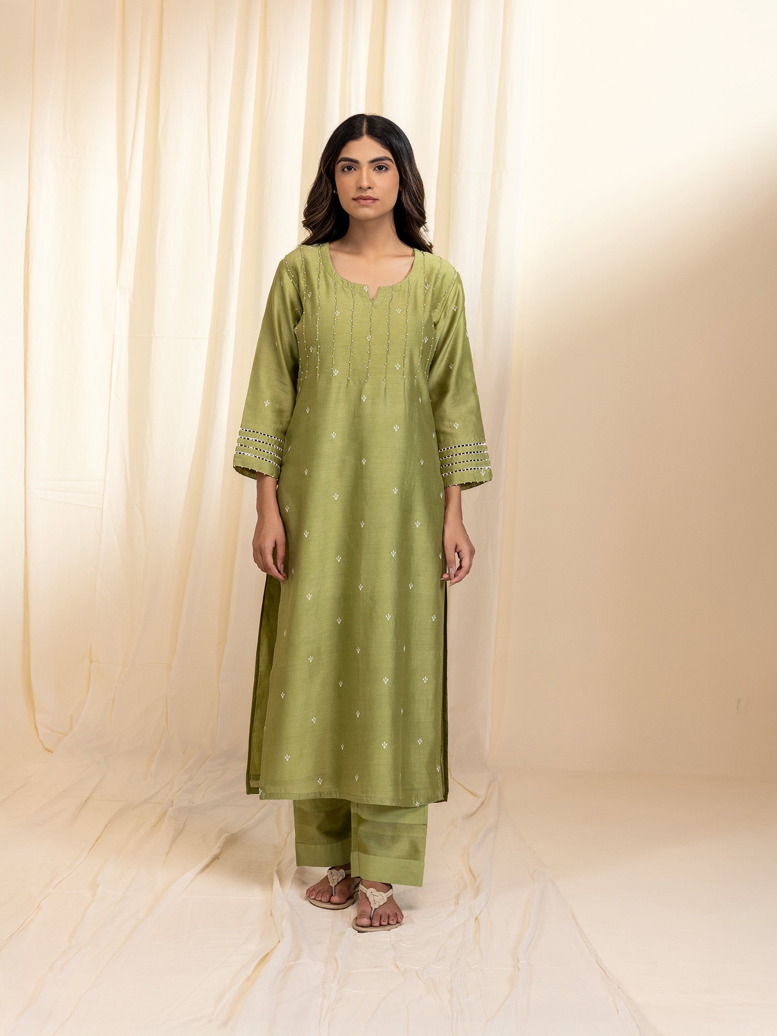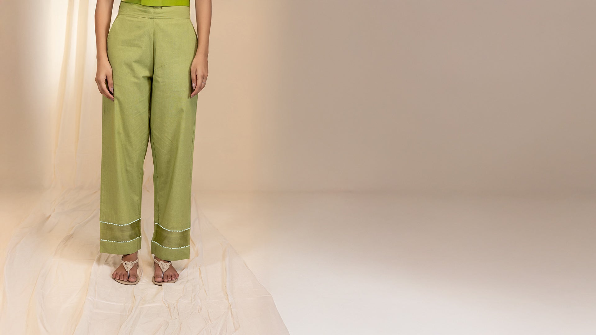 These light olive green cotton straight pants are detailed with a Chanderi insert near the hem, elegantly framed by a white scalloped lace border. They feature two side pockets and a semi-elasticised waist with drawstring, offering a perfect blend of comfort and understated style.