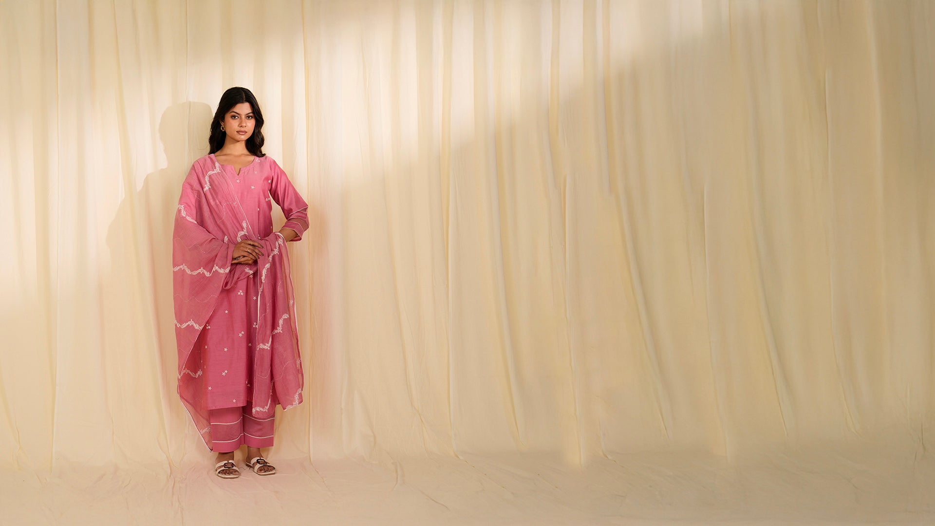 The deep rose pink Chanderi straight-cut kurta is adorned with scattered delicate white floral embroidery all over. The slit round neckline is highlighted with silver mukaish work, while three-quarter sleeves feature lace and sheer organza panels that create a beautiful see-through cut-out effect, that is further enhanced with mukaish. It's lined with soft voile for comfort.
