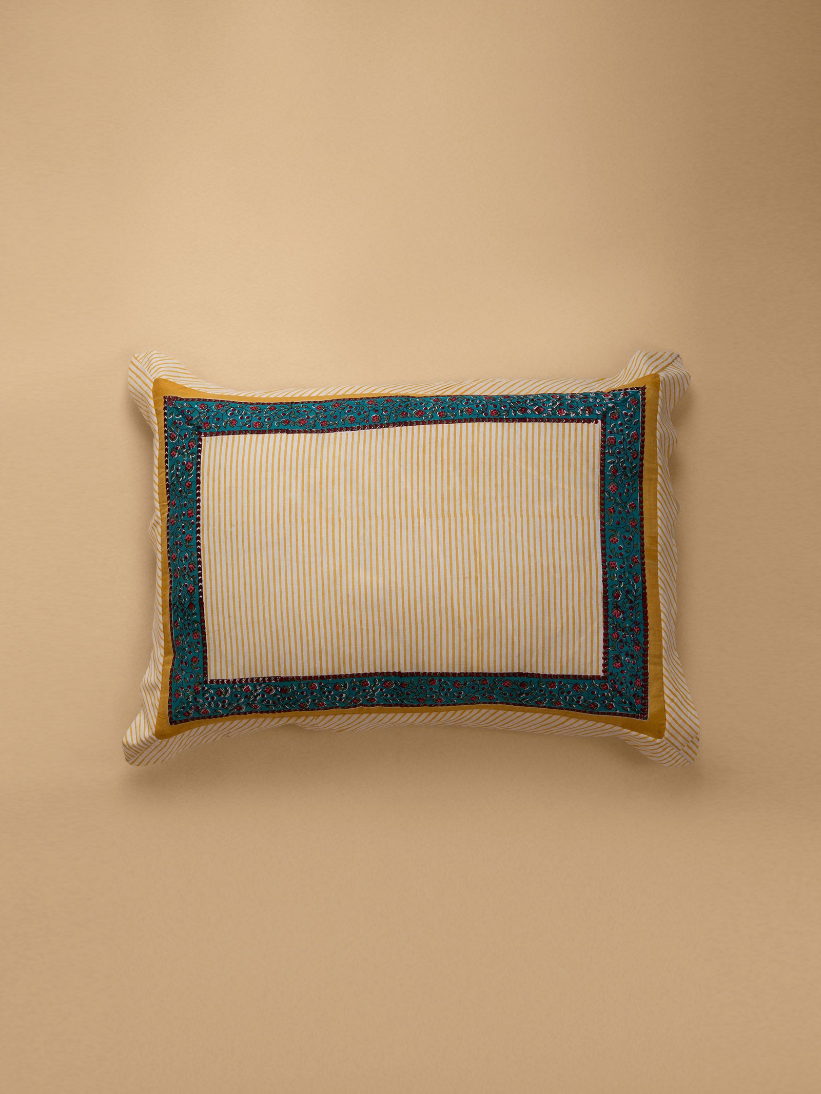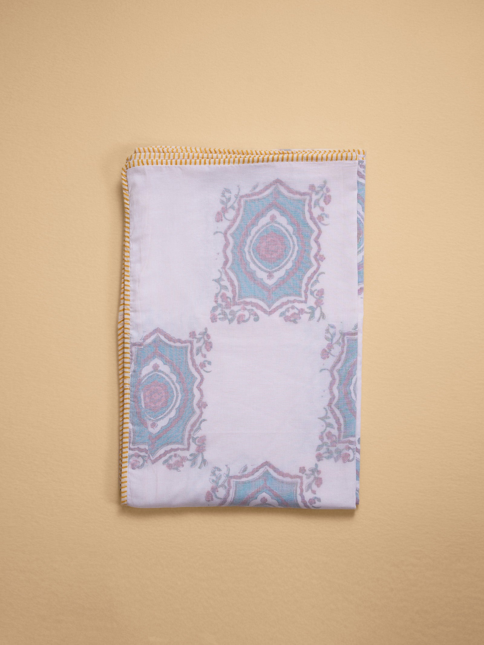 This reversible quilt showcases a vibrant Mandala-style lotus enclosed within a jharokha pattern crafted entirely from intricate floral vines, hand block printed for striking detail and surrounded by a wide, detailed floral border. The reverse side features the same jharokha design in subtle tones, alternating with graceful thin stripes. Filled with pure cotton and hand-stitched, it’s artistry with comfort.