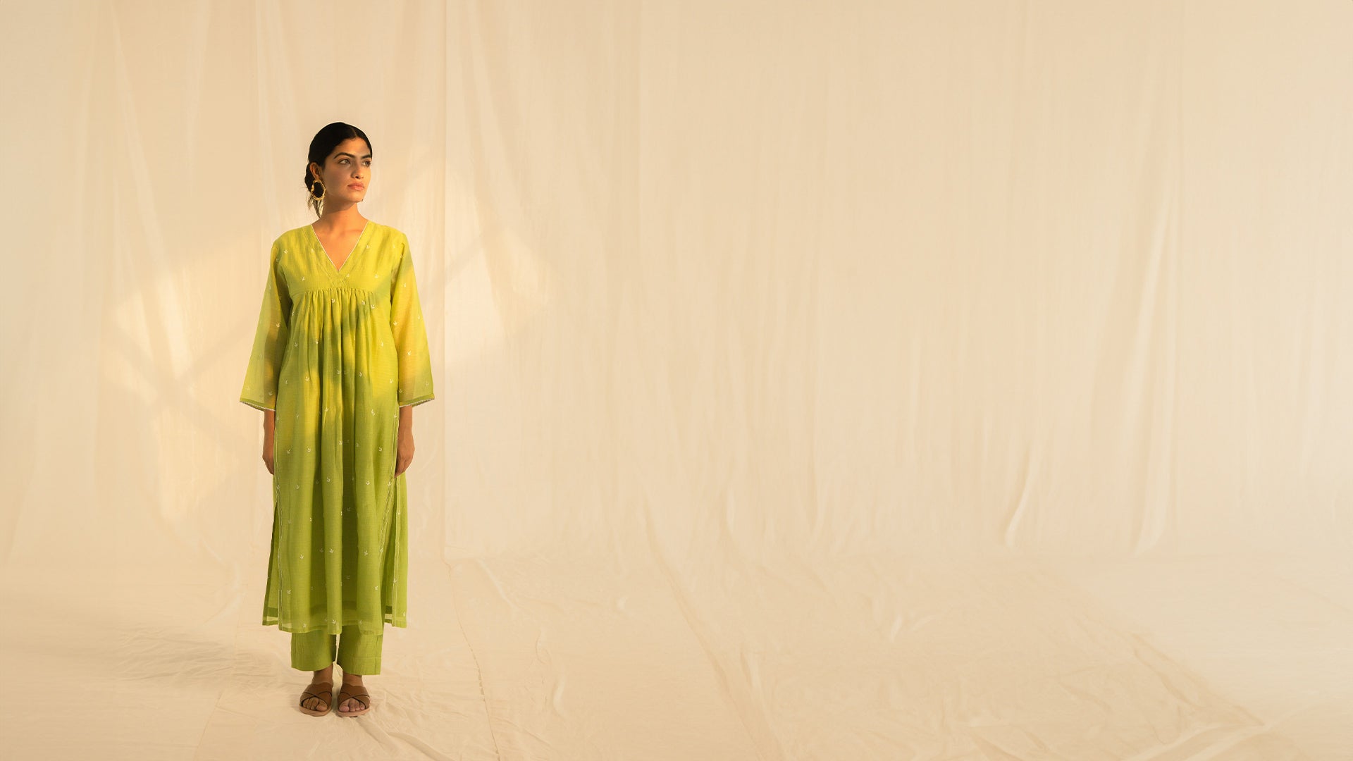 Crafted from soft chanderi fabric with a comfortable mulmul lining, this kurta features delicate machine embroidery, showcasing charming needlework motifs in a refreshing leaf green hue. Embellished with crocheted lace details and a relaxed silhouette, it combines traditional craftsmanship with contemporary style. All our garments are meticulously finished with French seams for durability and a refined look.