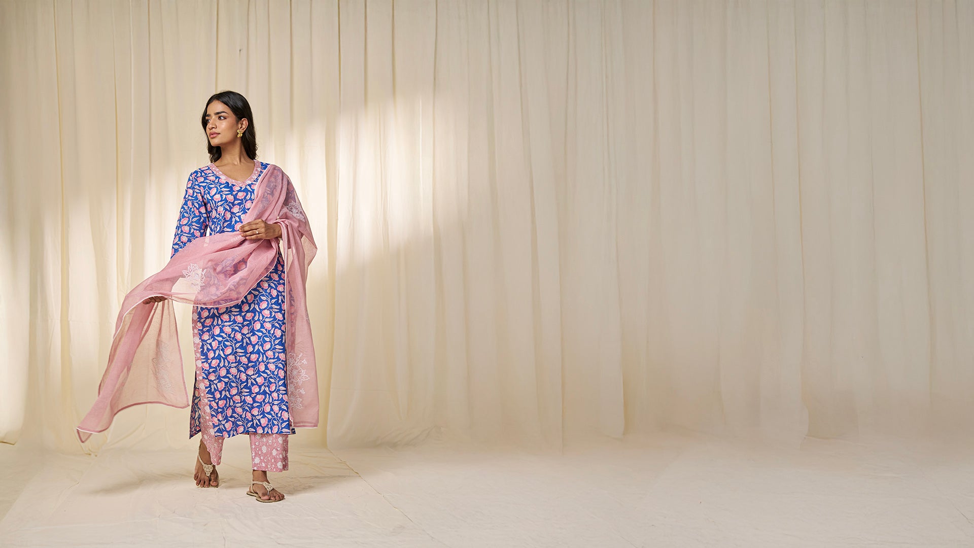 This straight cut hand block printed cotton kurta on a dark cobalt blue base is adorned with blooming pink and white flowers. Elegantly trimmed with a dusty rose block printed border. It features a rounded V neckline and three-quarter sleeves, perfect for stylish ethnic wear.