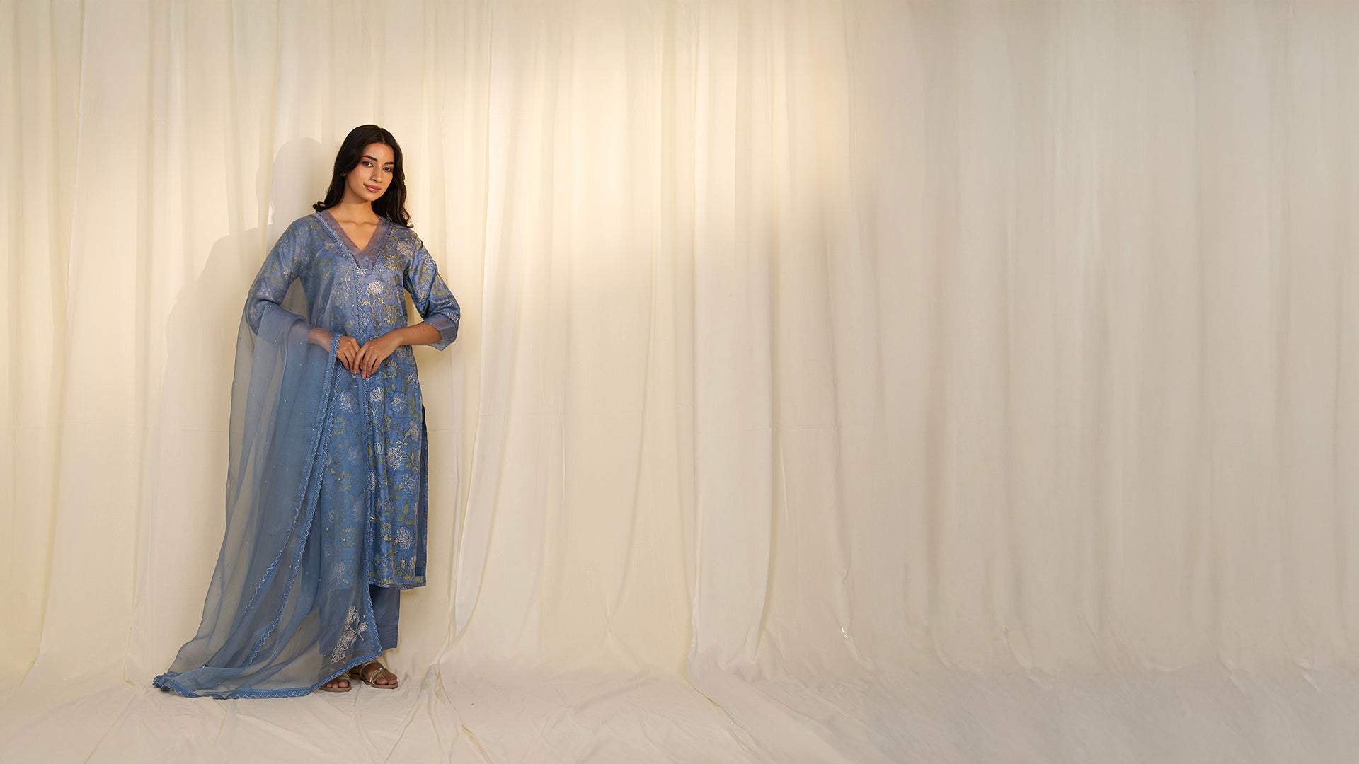 This straight-cut tussar silk kurta features an all-over hand-block printed abstract floral pattern, inspired by Indian chintz, in soothing shades of slate blue and green. Some prints are highlighted with aari-tari handwork in silver zari and sequins. It's styled with an sequined organza panel and lace trim at the V neckline and three-quarter sleeves. The kurta is lined with soft voile for comfort.
