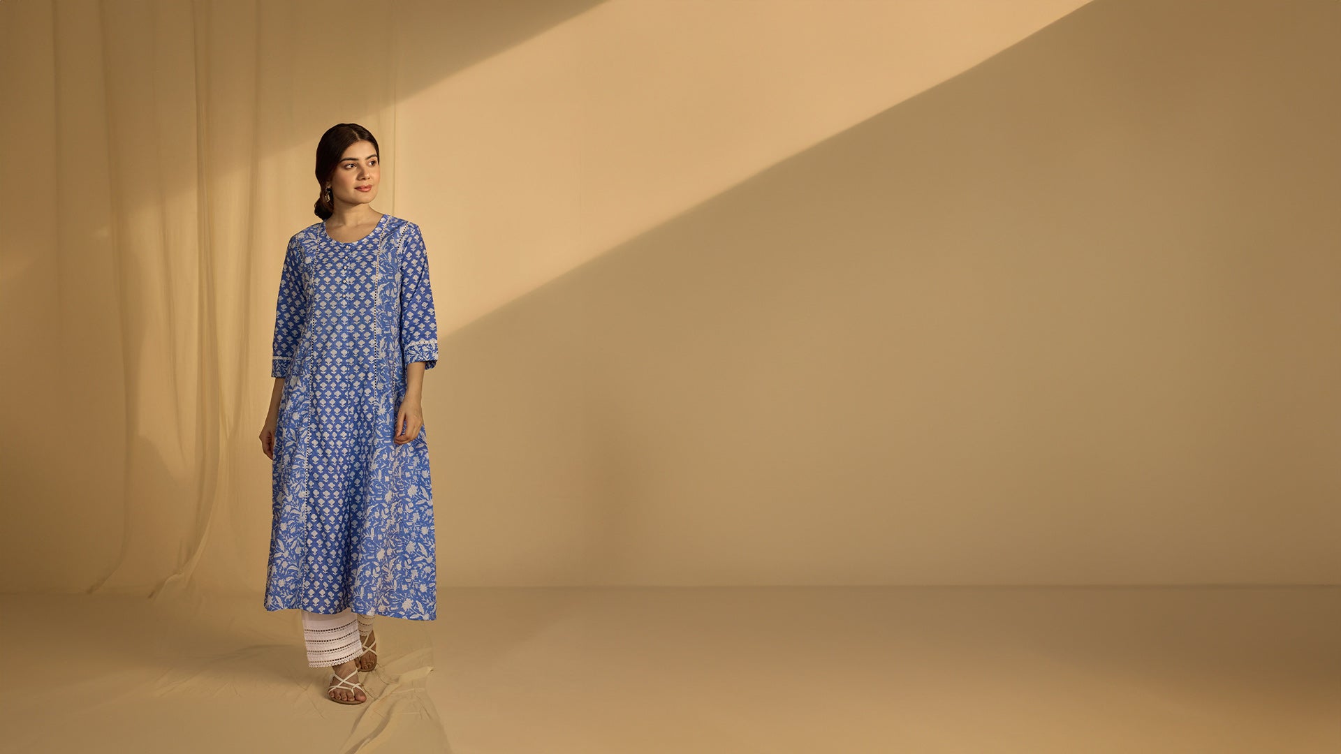This Hand-Block Printed cotton kurta in a vibrant blue captures the essence of a clear summer sky, adorned with pure white floral motifs reminiscent of drifting clouds. Featuring a fit-and-flare silhouette, the kurta includes window lace Embellishment along the princess lines, intricate lace at the sleeve cuffs, and handmade buttons at the placket, adding a touch of elegance.