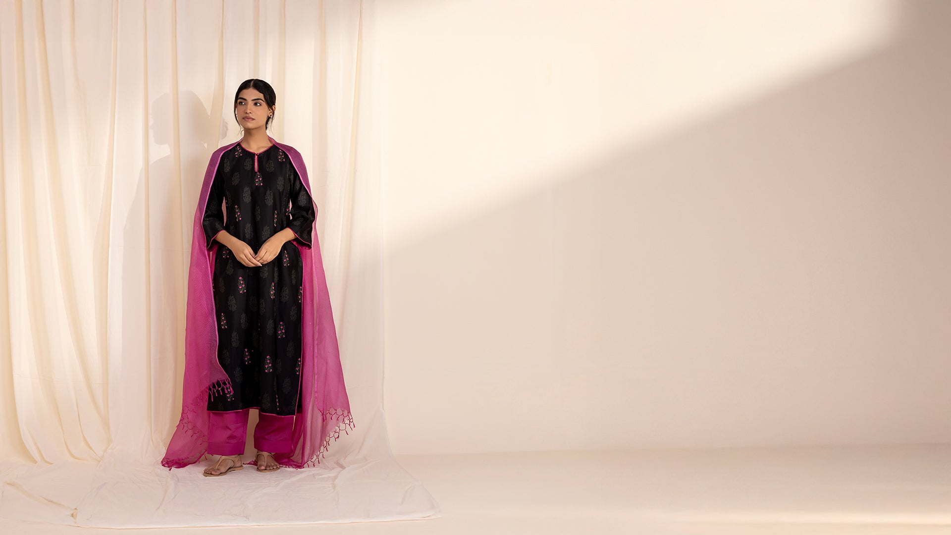 This jet black Chanderi kurta with a high neckline and button opening is hand block printed with Mughal floral motifs in deep grey. Select prints are enhanced with hand-embroidered flowers and pearls. Pleating details from the shoulders to the waist create a graceful fit-and-flare silhouette. Hot pink piping trims the straight-cut, 3/4 sleeve kurta, adding contrast and bold details.