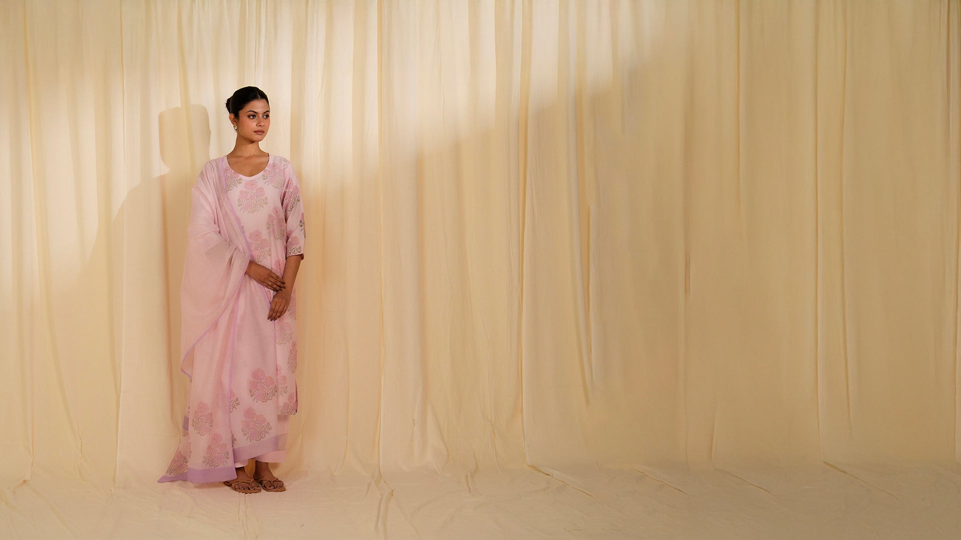 This baby pink hand block printed straight-cut kurta features all over botanical flower prints in lavender, peach, and sea-green with gold highlights. A delicate pink border frames the side slits and 3/4 sleeve hems. This chanderi kurta is lined with voile and a U-neckline.