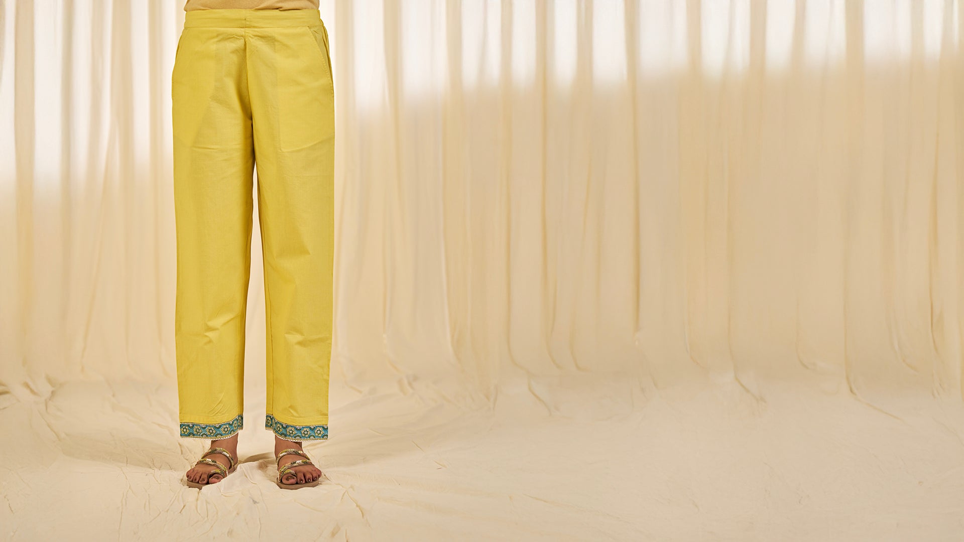 These bright lemon yellow straight cut cotton pants feature a turquoise floral border with crochet lace at the hem. They are designed with two side pockets and a semi-elasticated waistband with drawstring.
