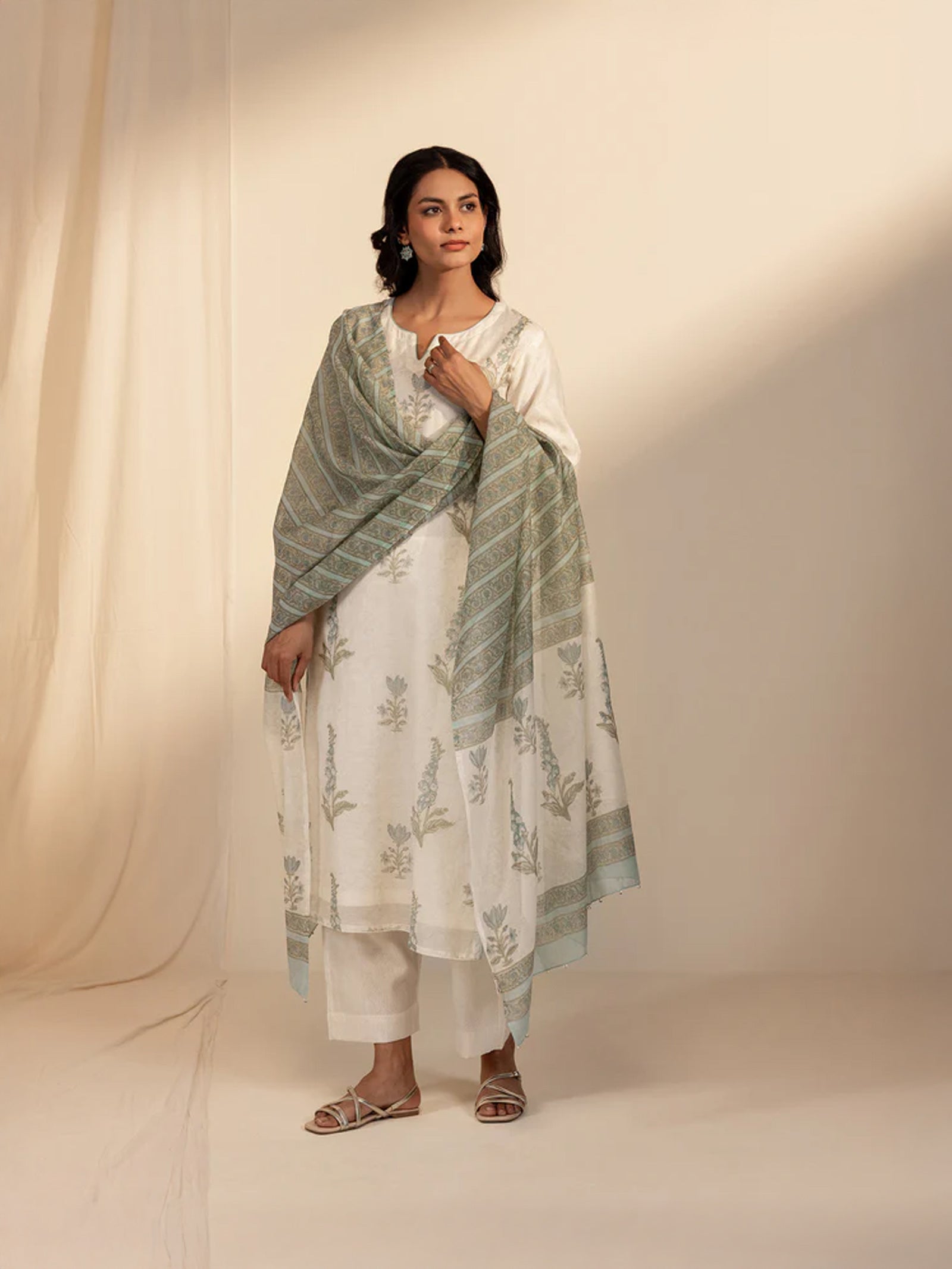 This ivory Chanderi kurta showcases a refined print-on-print design, featuring Mughal-inspired floral vines overlaid with multicolored floral motifs. Each flower, embellished with shimmering silver mukaish work; it is lined with voile and a soft peach piping, complementing its elegant straight-cut silhouette.