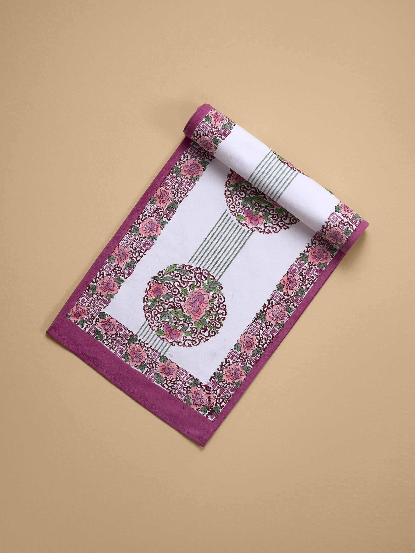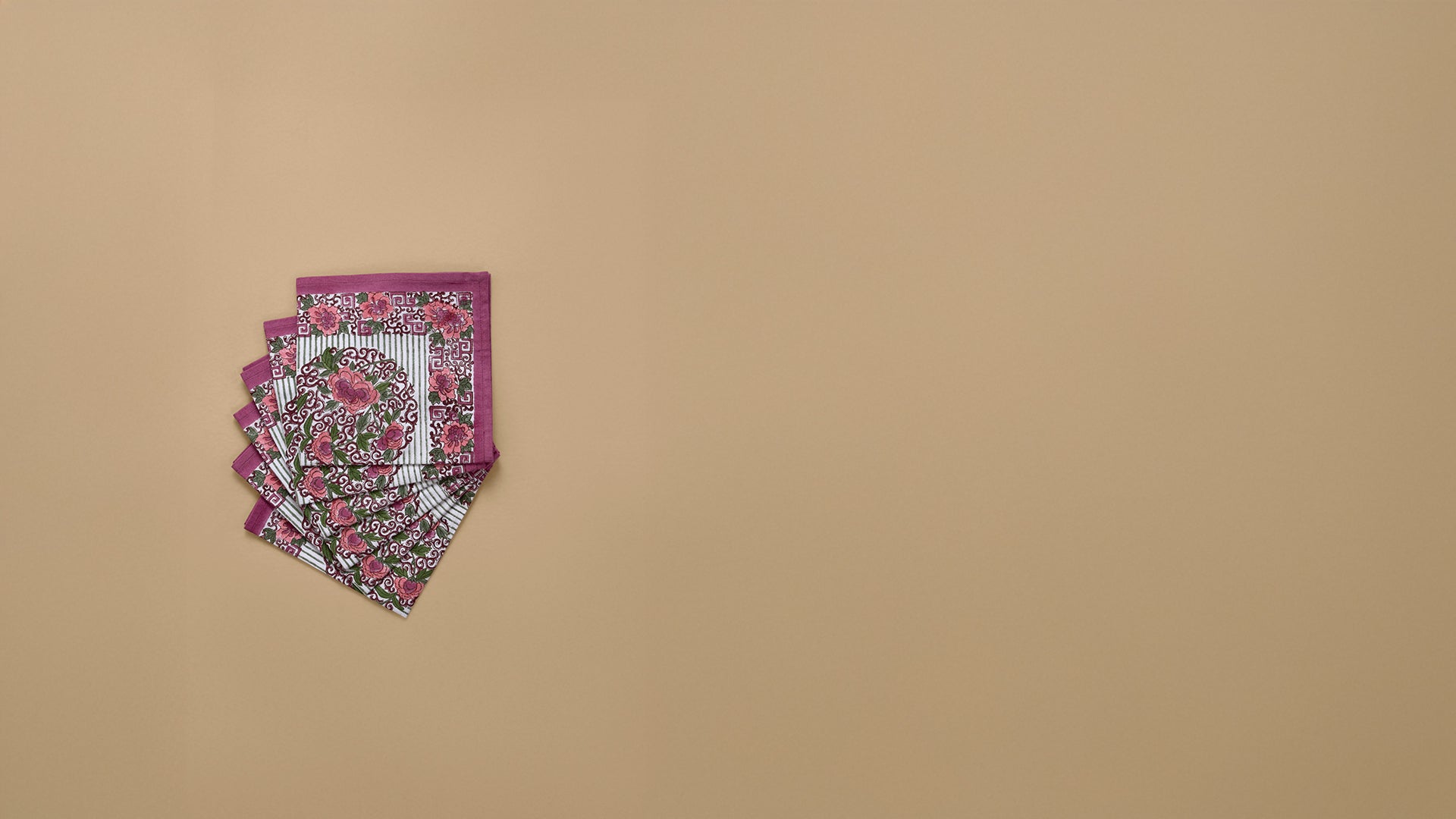 This set of six hand block printed dinner napkins features a Chinoiserie-inspired medallion with peony flowers on one corner. The centre is printed with fine green stripes, framed by floral and geometric borders. It is rendered in soft shades of pink, peach, and green.