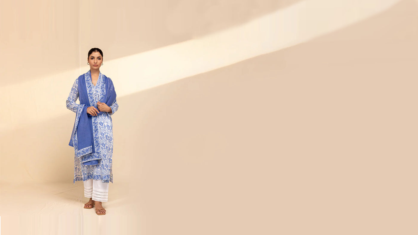 Hand-printed in vibrant purplish blue and full sleeved, this voile kurta features a collared V-neckline with gather details, embellished with silver sequins and white pearls. Crocheted lace and printed border detailing at the cuffs, flare and neckline add a touch of elegance to its sophisticated design.