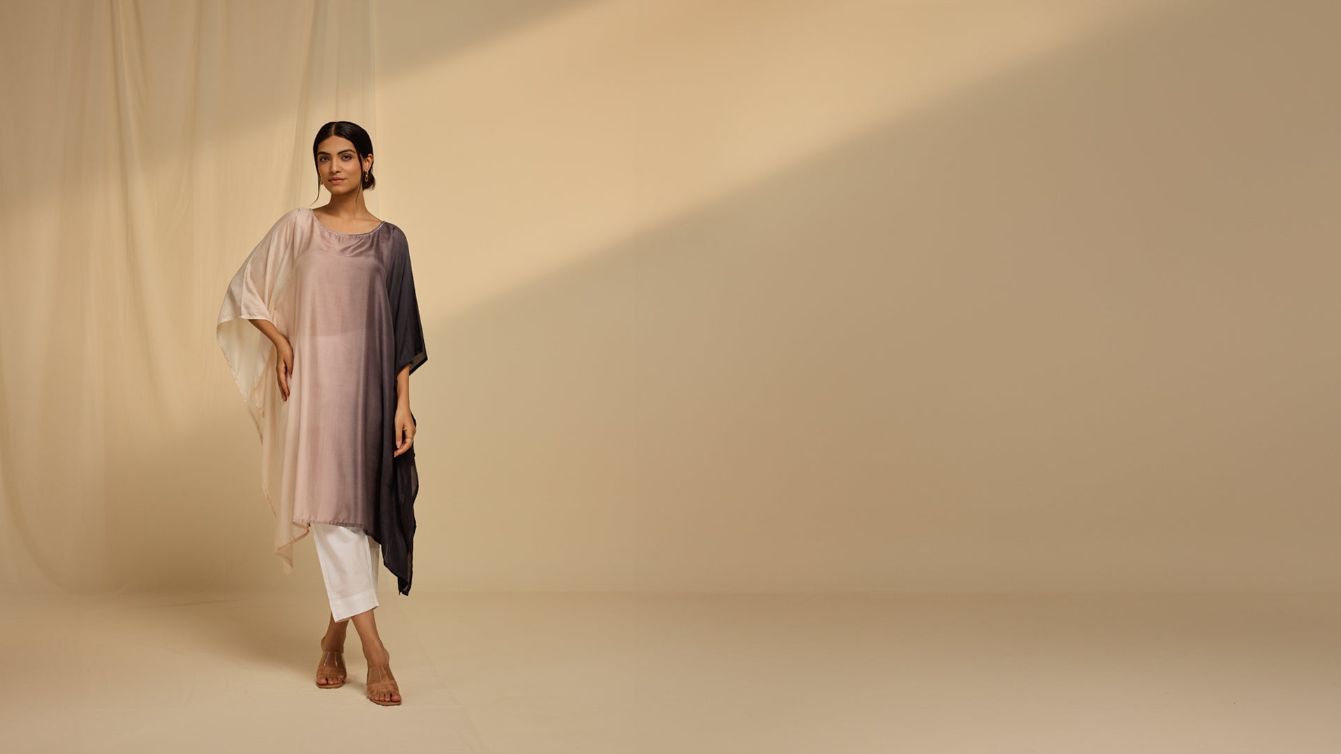 Seamlessly transitioning from ivory to black this Ombre Black Silk Kaftan is designed for effortless elegance. Made from lightweight silk, this kaftan features a relaxed silhouette and is adorned with silver sequin embellishments in kantha stitch on the neckline.