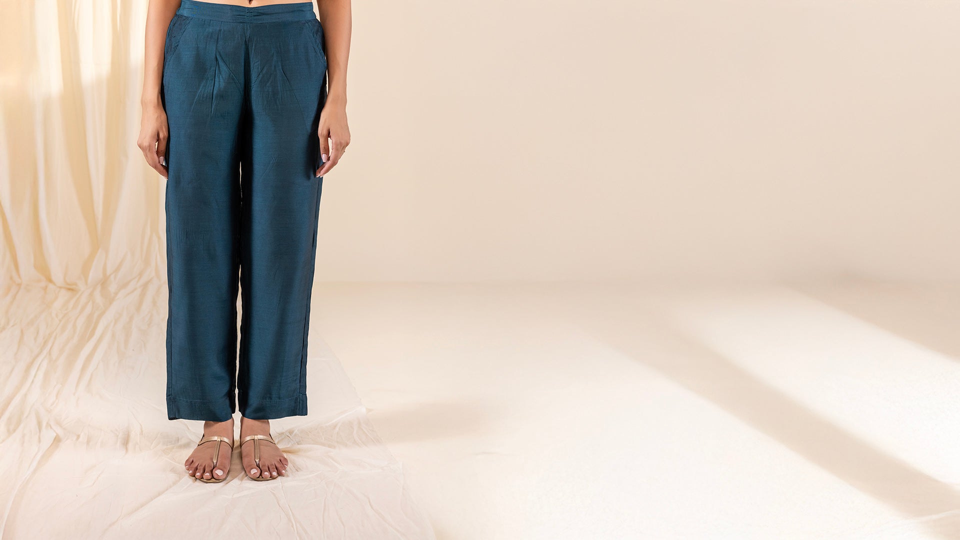 These dark aqua modal muslin pants offer a tailored fit that’s both versatile and elegant. Designed in a straight cut, they feature a voile lining for added comfort, along with two side pockets and a semi-elasticised waist with a drawstring.