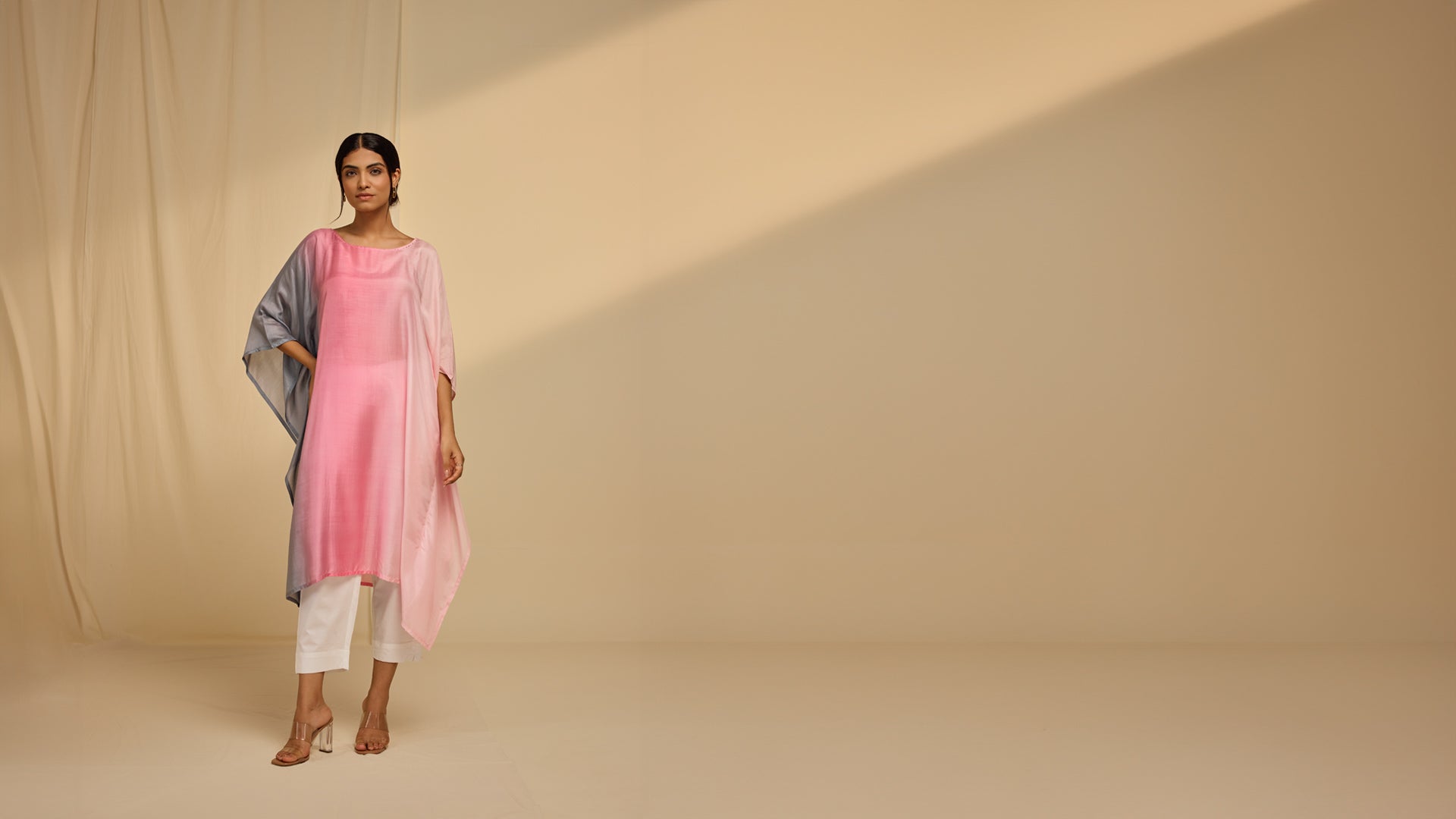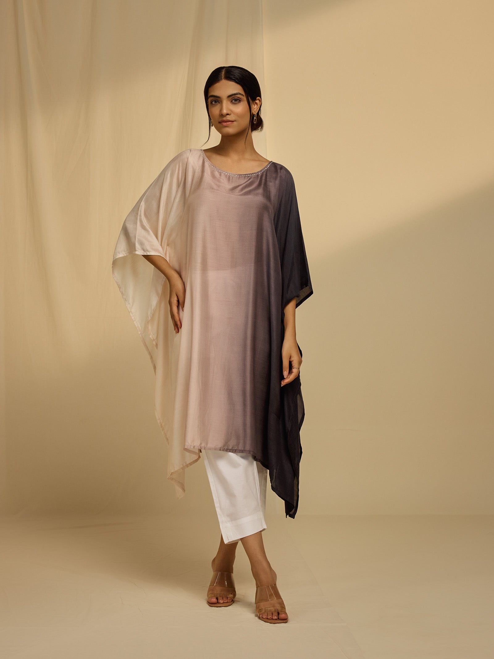 The Ombre Pink Silk Kaftan blends seamlessly from grey to pink and is designed for effortless style and comfort. With a relaxed silhouette and lightweight silk fabric, it’s ideal for resort wear or any sun-soaked adventure. The kaftan features silver sequin embellishments in kantha stitch on the neckline, adding a subtle touch of elegance.