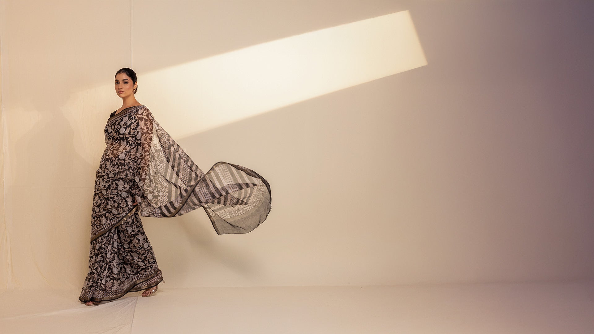 This saree exudes timeless sophistication with its striking black base adorned with intricate floral patterns in soft, contrasting hues. The elegant border and subtle sheen add a touch of glamour, making it an exquisite choice for evening soirées and festive celebrations.