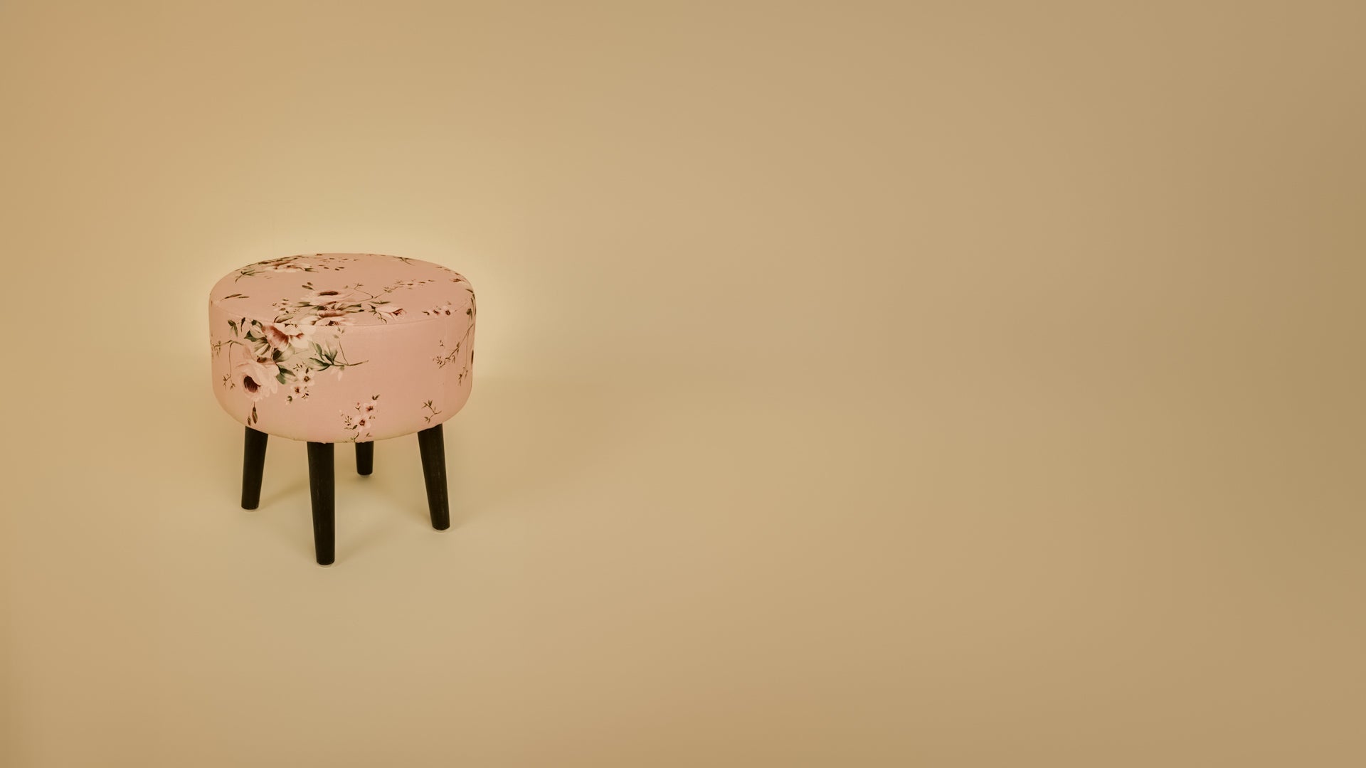 This round ottoman stool is a perfect blend of style and functionality. The cushioned seat is wrapped in a durable printed canvas, showcasing a delicate floral pattern on a soft pink background, adding a touch of charm to your space. Handcrafted from high-quality wood, this stool is ideal for use in any room, providing a versatile seating option with an elegant finish.