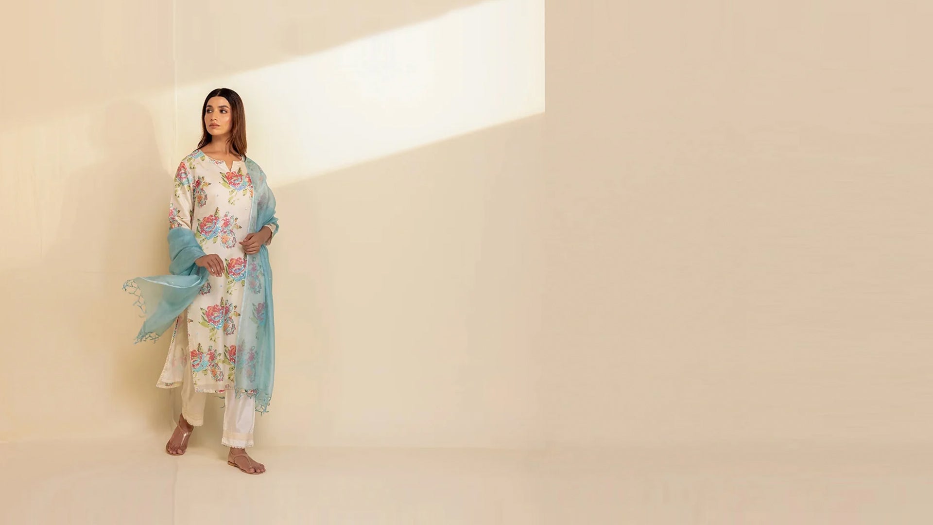 This elegant tussar silk kurta is adorned with hand block-printed large roses, their beauty highlighted by aqua blue sequin embellishments. Edged with delicate scalloped lace, it features a round neckline, 3/4th sleeves, a straight cut, and voile lining, offering a perfect blend of sophistication and charm.