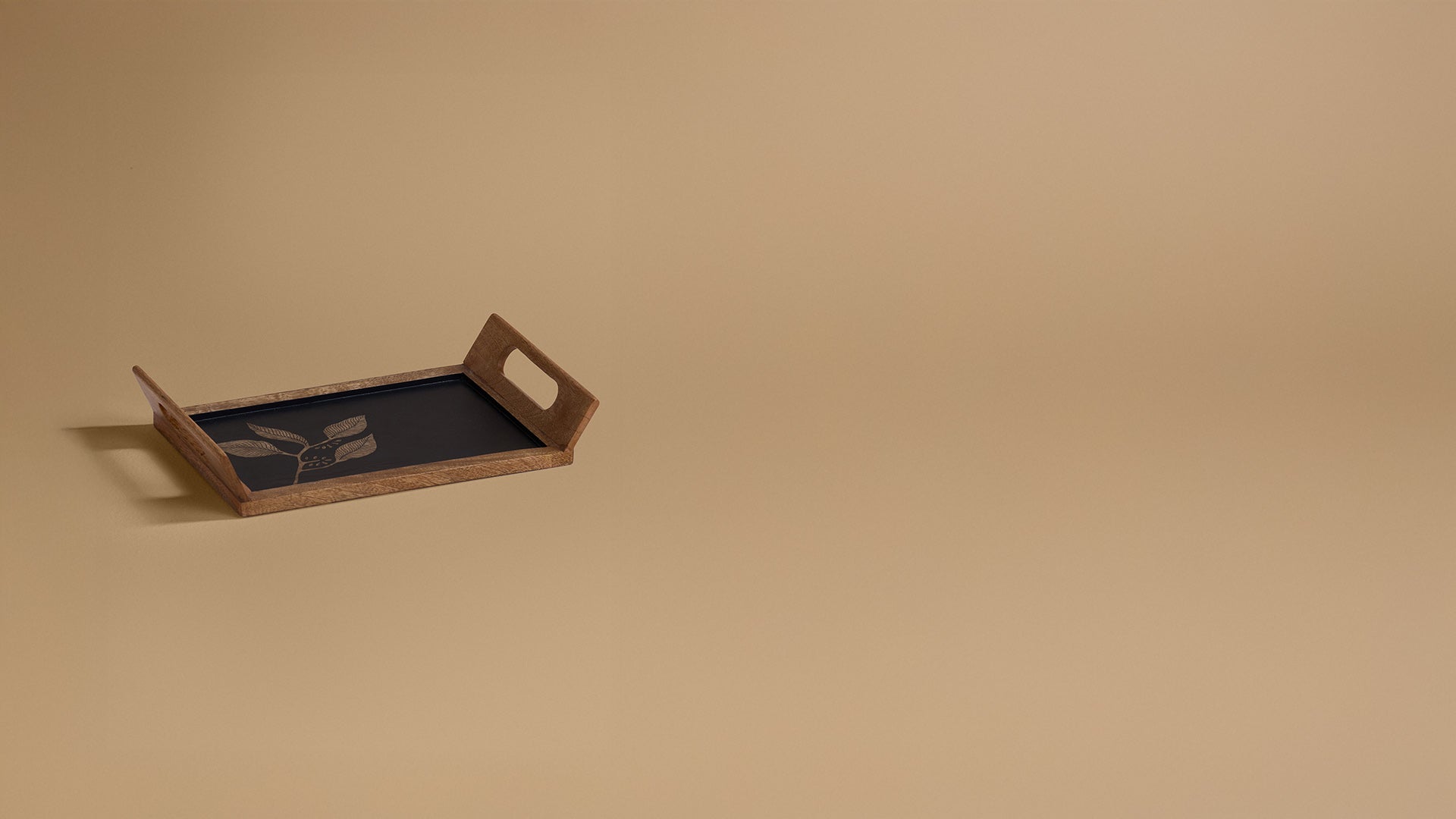 Exquisitely handcrafted and hand painted in a rich black finish, this elegant wooden tray features a graceful leaf motif that adds a touch of artistry. Designed with two side handles for easy and secure handling, it serves as both a functional piece and a refined accent, effortlessly enhancing the ambience of any space.