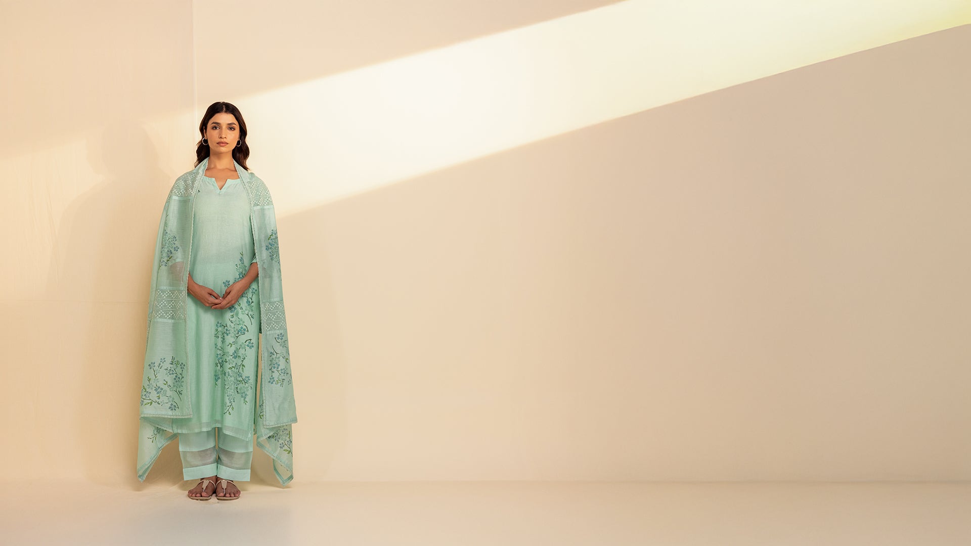 This mint green Chanderi kurta features exquisite hand-block prints, resembling a delicate watercolor painting created with brushstrokes. Designed in a straight fit, it is adorned with shimmering mukaish work on the precisely placement-printed flowers, lined with soft voile and finished with a round neckline for effortless elegance.