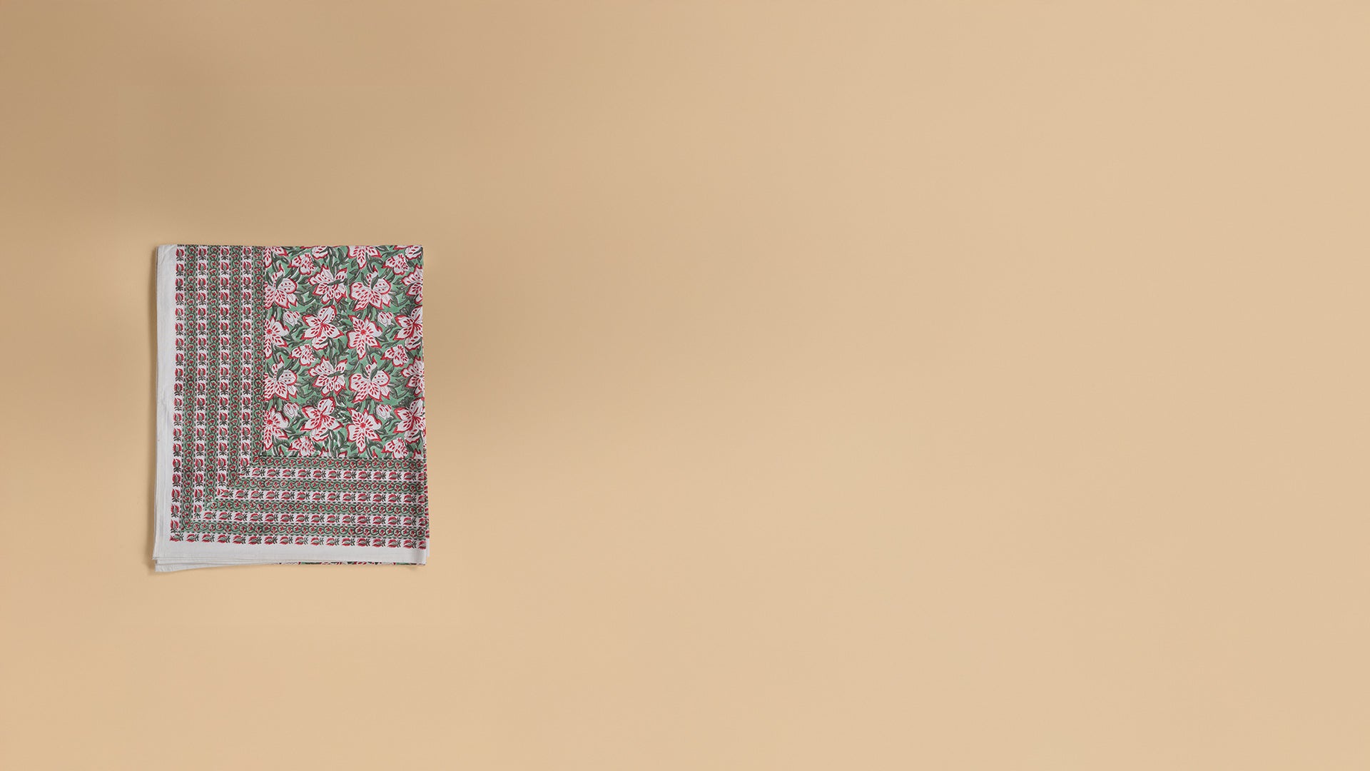 A vibrant bedcover hand block printed in striking red and green on a crisp white base. Bold lily-like flowers with dotted petals bloom across a dense field of foliage, framed by intricately patterned floral borders in coordinated hues. The contrast between the lush central print and the finely detailed edging gives it a lively, festive character.