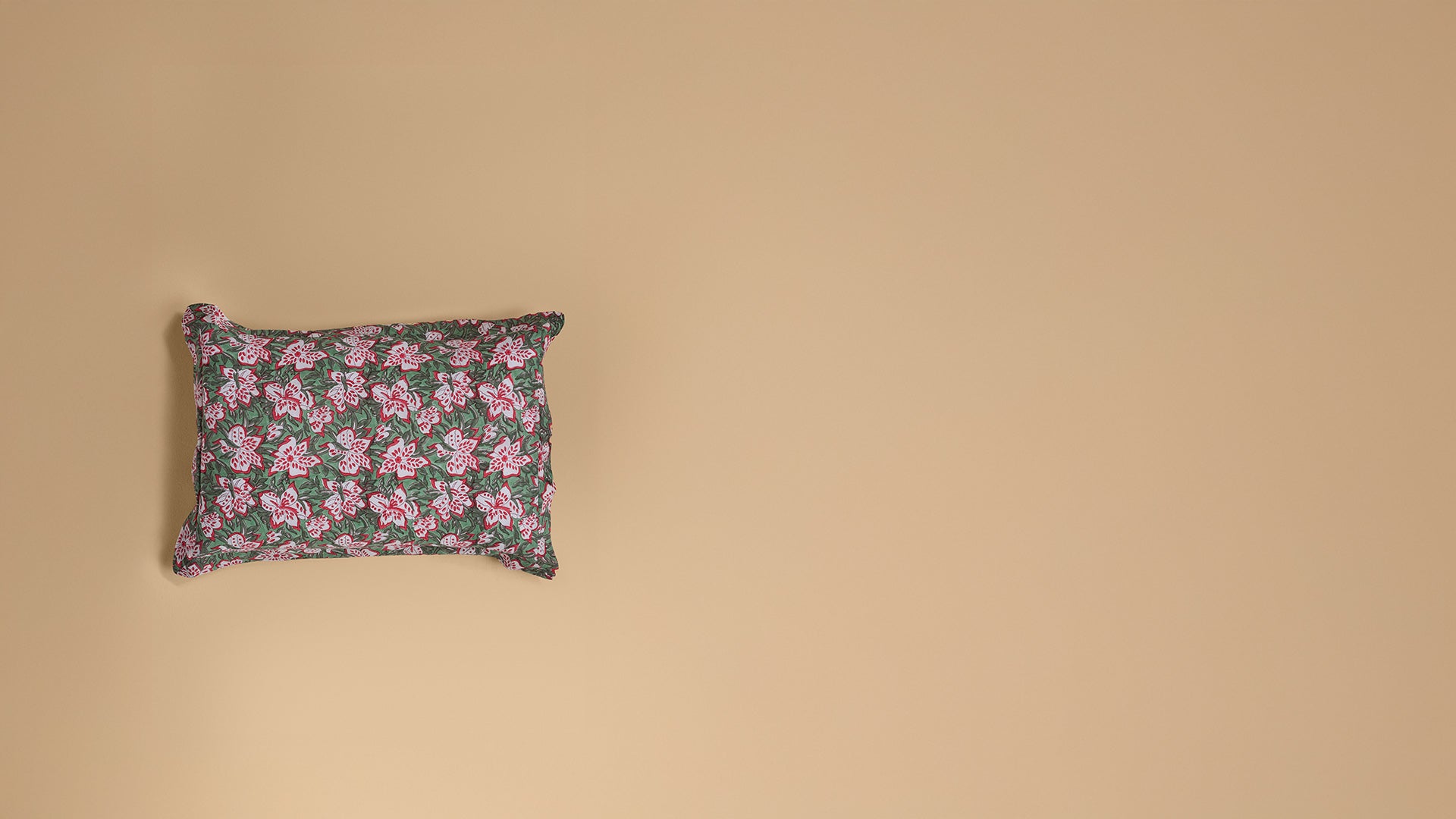 This set of two pillow covers features a vibrant hand block printed design of red floral blooms with dotted petals nestled in lush green foliage, all on a crisp white base. Without borders, the print flows seamlessly across the surface, offering a rich yet uncluttered look. Crafted to complement the matching bedcover, they add a refined touch.