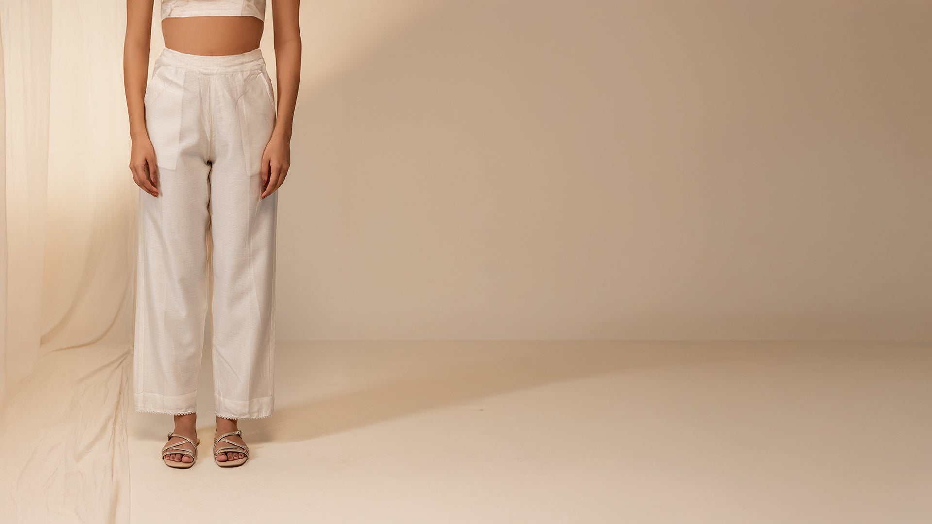 These elegant ivory Chanderi pants are lined with soft voile for added comfort. Featuring a delicate white pearl lace edging at the hem, they offer a refined touch, along with two side pockets and a semi-elasticized waist with a drawstring for a perfect fit.