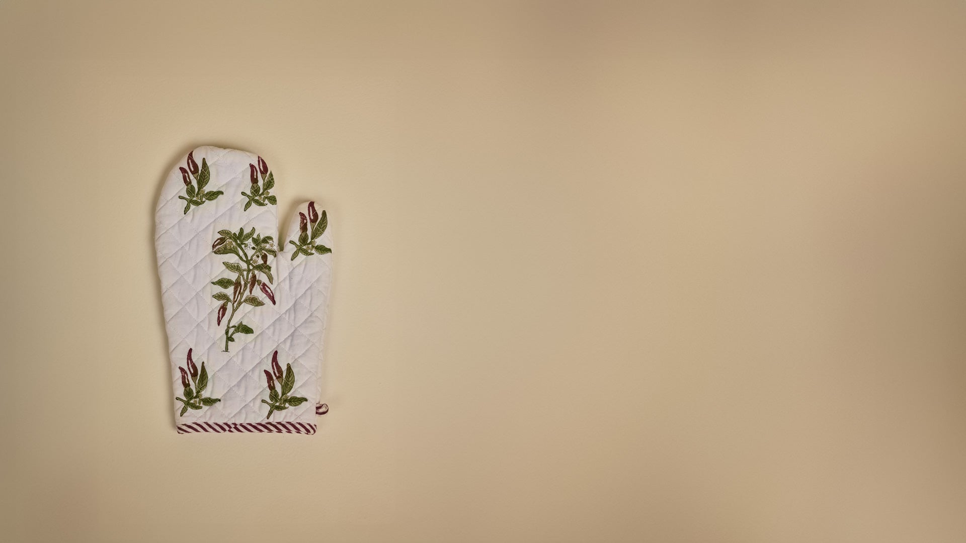 The Peri Oven Mitten is adorned with a bold hand-block printed design inspired by the vibrant peri peri pepper. Made from cotton and lined with heat-resistant padding, this mitten offers both style and safety.