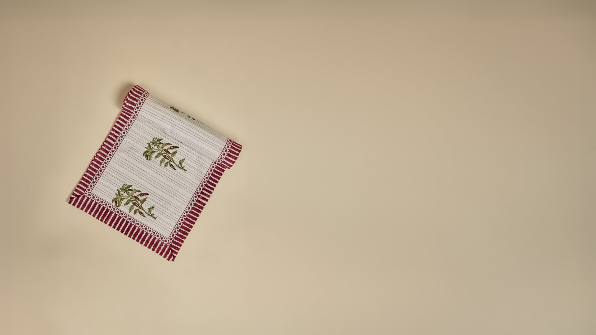 The Peri Peri Table Runner showcases a bold hand-block printed design with vibrant red chili peppers on a backdrop of fine stripes. The runner is bordered with a red striped trim, adding a touch of spice to your dining experience.