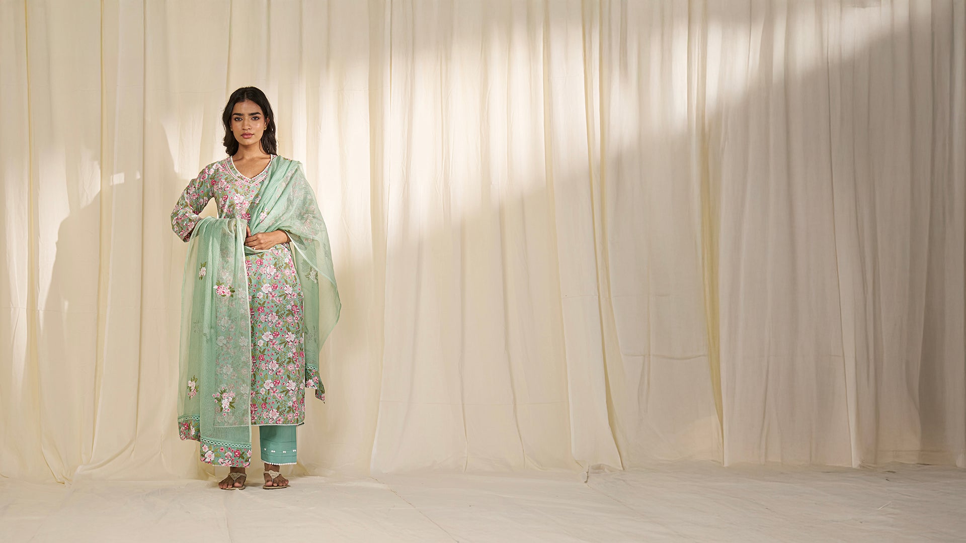 This straight-cut cotton kurta features hand block print of scattered pink and white floral motifs with green leaves on a mint green base. A rounded V-neckline is trimmed in white lace and embroidery detailing on the front and back. It's 3/4 sleeve hems have glass beads in kantha stitch, pintucks, and lace. White scalloped crochet lace frames kurta hem and side slits.