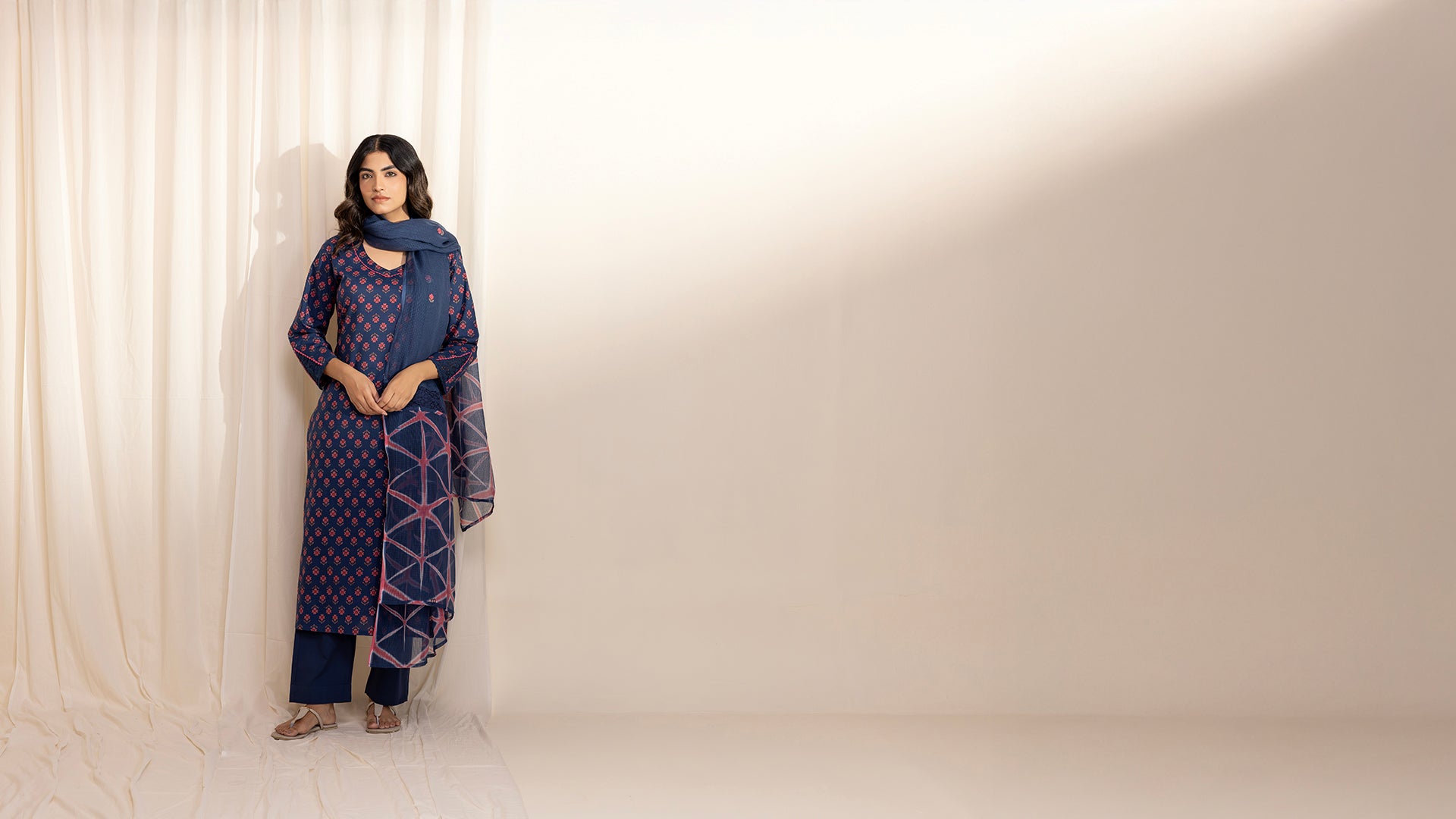 This V-neck navy-blue cotton kurta is adorned with delicate hand printed pink flowers. The neckline and crochet lace insets on the 3/4 sleeves are edged with pink scalloped lace. This straight-cut kurta exudes understated elegance and timeless appeal.